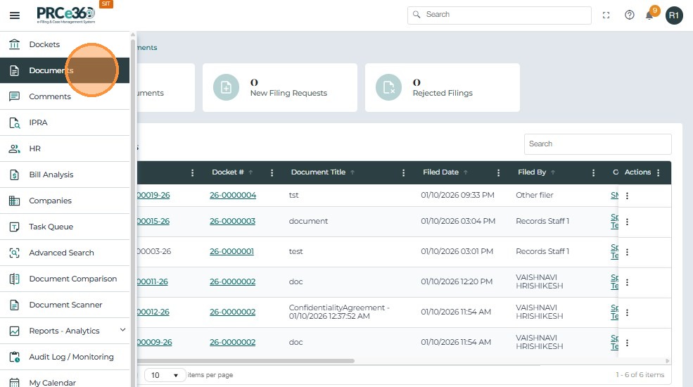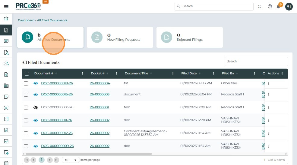 The Documents Dashboard provides a centralized view of all cases and requests related to document filings within the system.