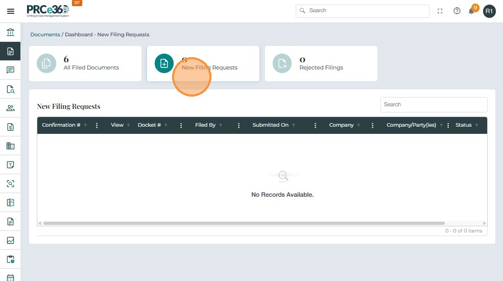 | New Filing Requests | Records Division only | Lists all document filings pending review. |