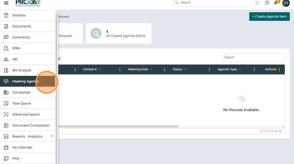 The Meeting Agenda Dashboard displays all cases and tasks related to agenda item creation and management.