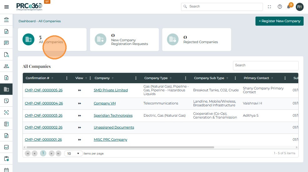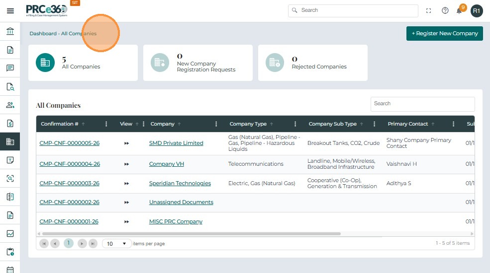 - Confirmation #, Company, Type / Subtype, Primary Contact, Submitted On, Status
