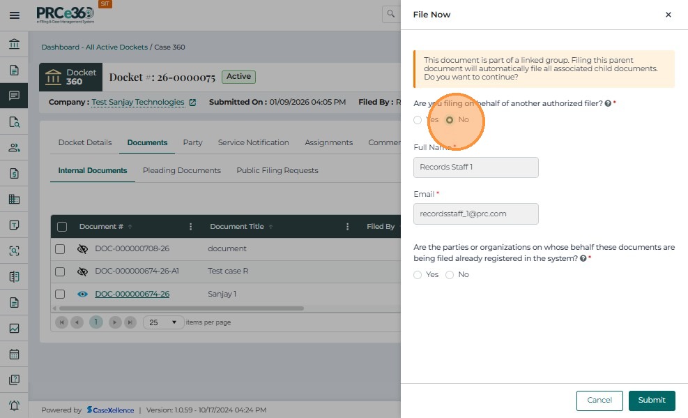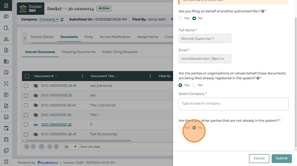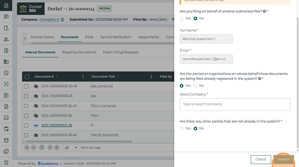 • Click Submit to file the document.