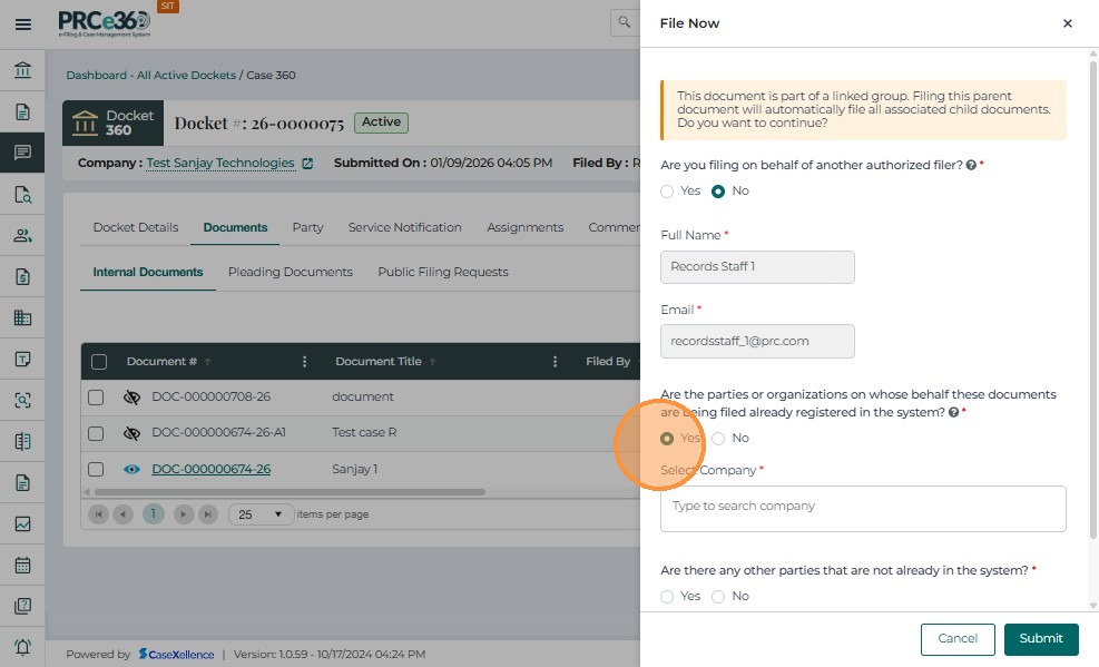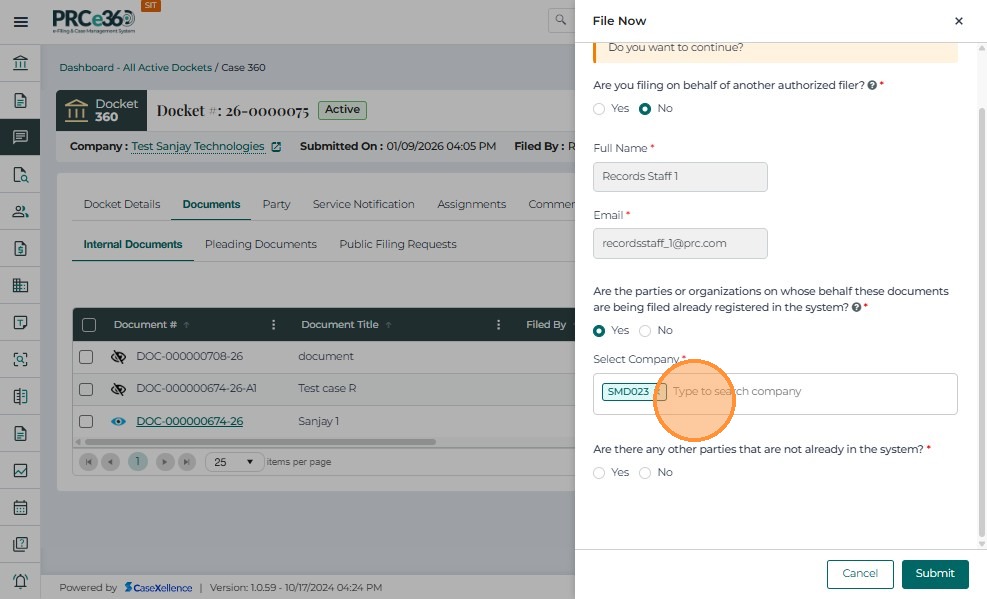 If the party or parties on whose behalf the document(s) are being filed already exist in the system as companies: