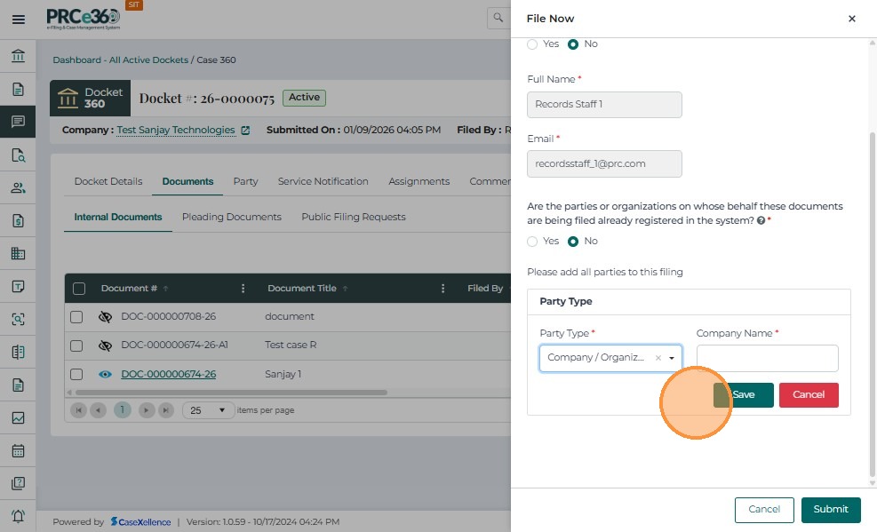 If the party or parties on whose behalf the document(s) are being filed do not exist as companies in the system: