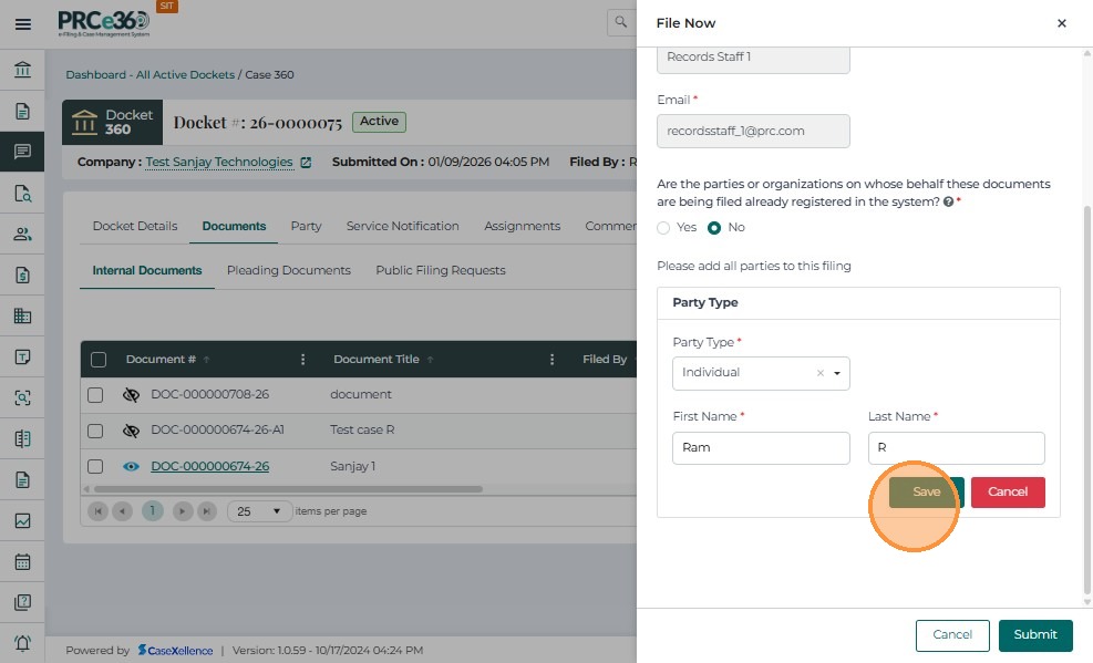 • Click on Actions next to the document and select File Now.