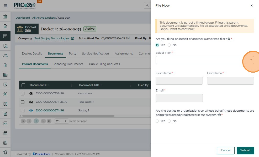 • The File Now option is available in the Internal Documents tab.