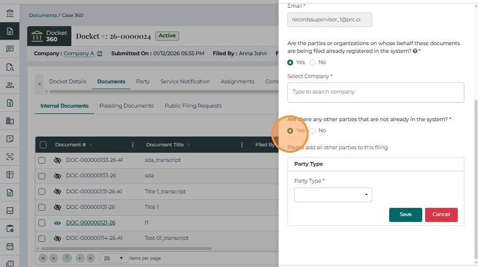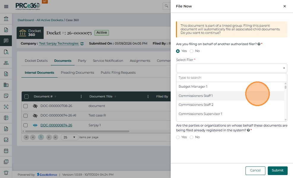 The Document Filing Request feature allows authorized internal users in the Records, Legal, and Hearing Examiners divisions to initiate a controlled process that converts confidential or restricted documents into public filings when appropriate.