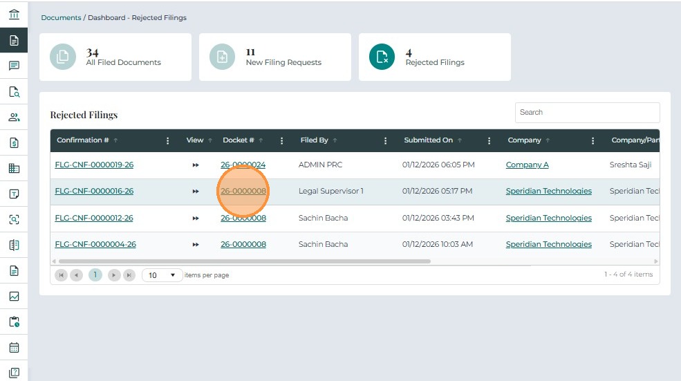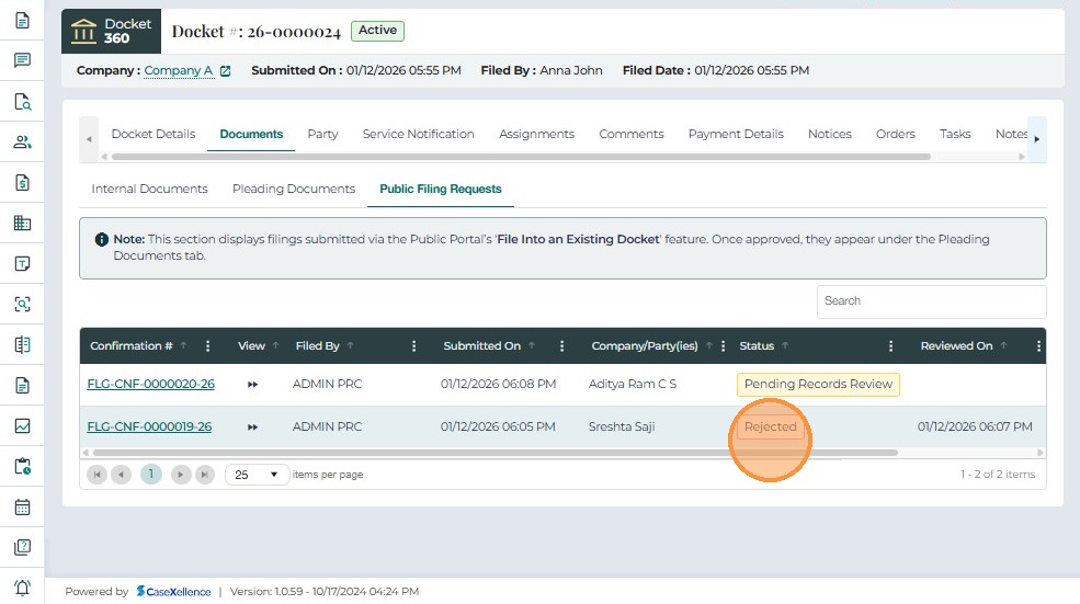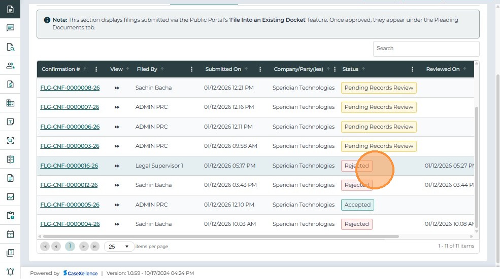 • Rejected On – The date and time when the filing was rejected.