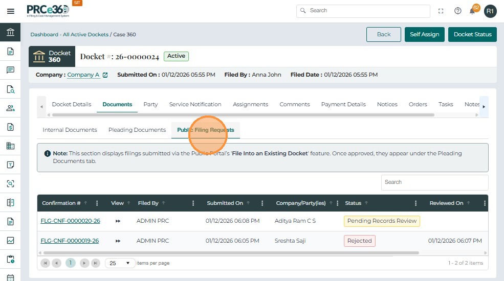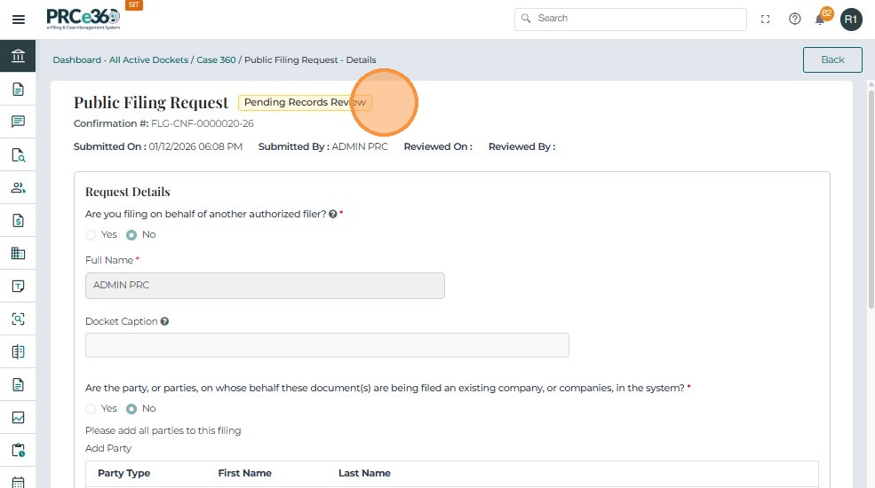 Filing Request Through Public Filing Requests Tab