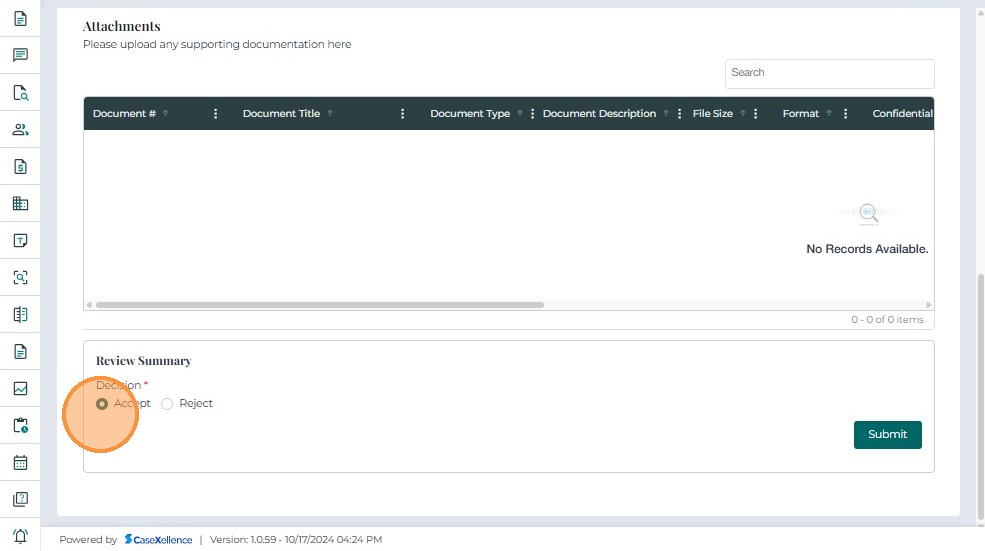 • Click Submit once the review is complete and a decision (Accept or Reject) has been selected.