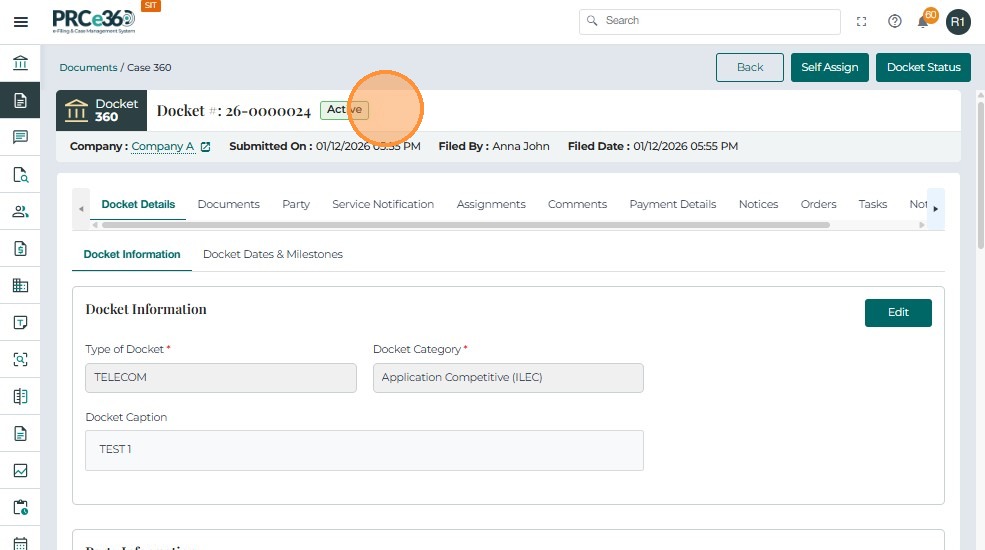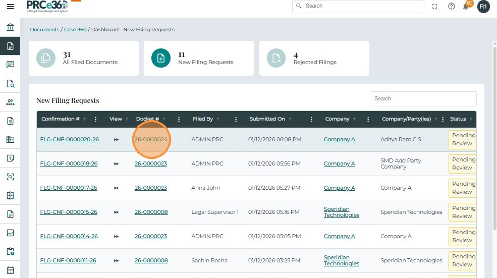 • Click on the Docket # to navigate to the Case 360 view of the case.