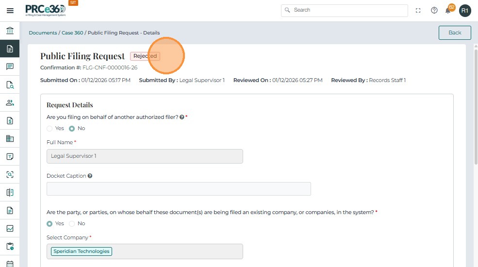 • In the Public Filing Request tab, the filed document will be listed with the status Accepted.