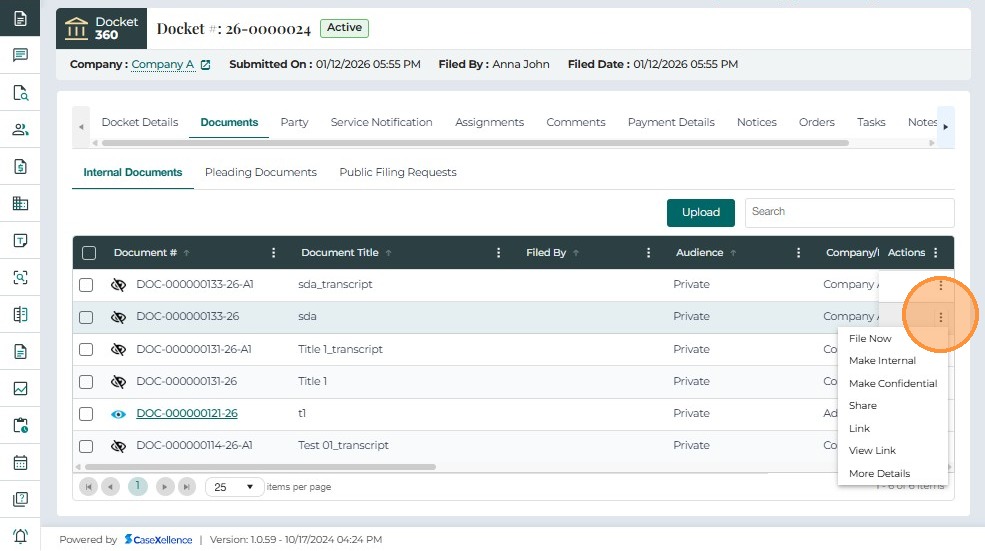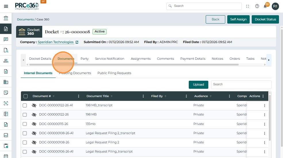 • In the Internal Documents tab, all uploaded documents are listed with their current status.