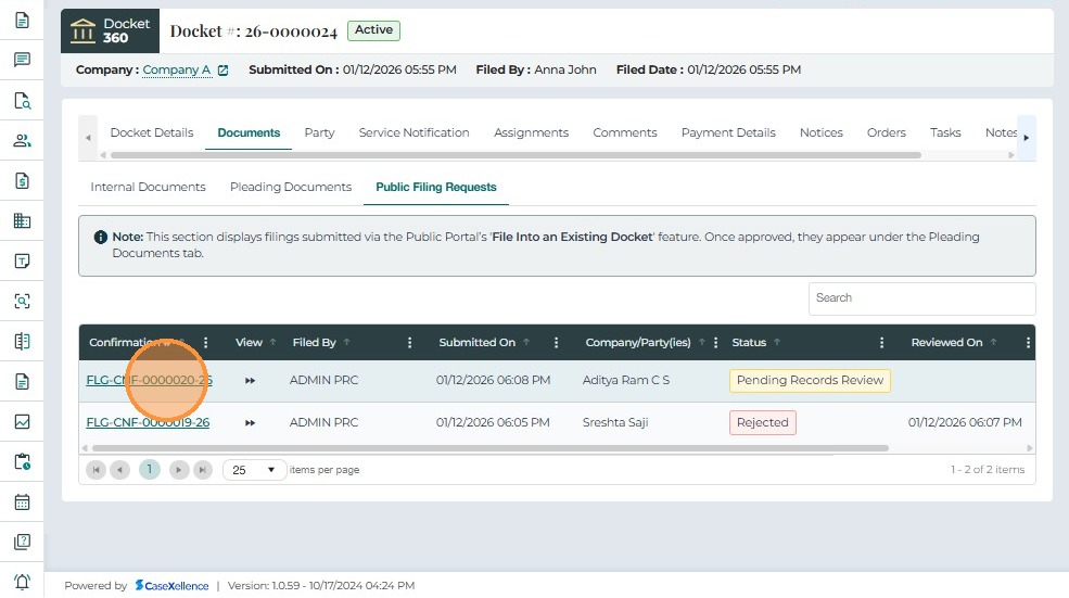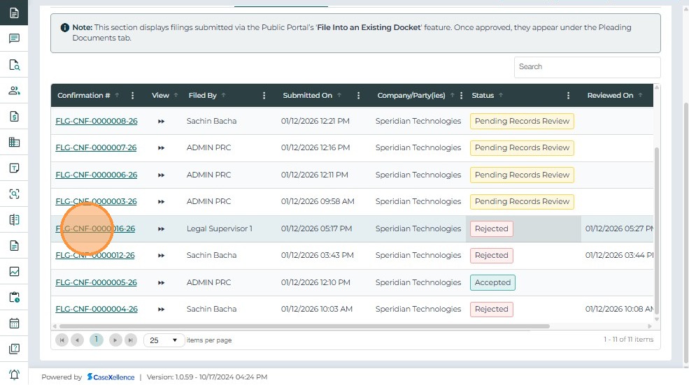 • Submitted On – The date and time when the filing request was submitted.