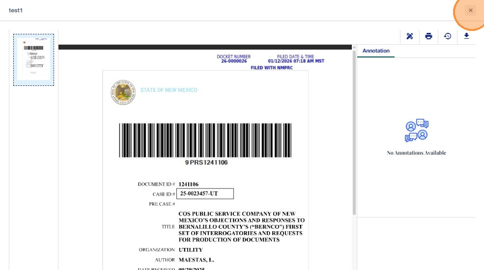 • Click on the Documents tab and open the Public Filing Request section to view the filing details.
