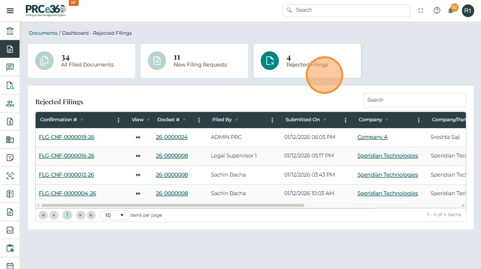 • The rejected document will be listed with the status Rejected.