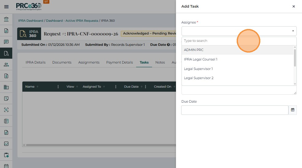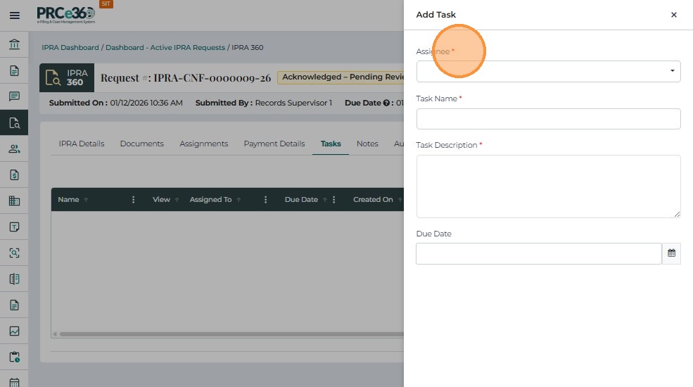 • Assignee – Select the user responsible for the task (e.g., Records Staff 1).