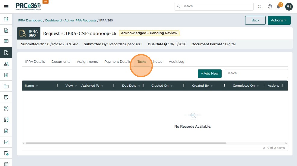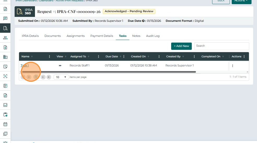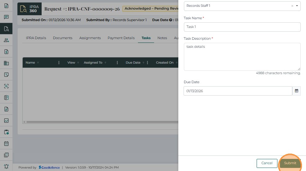 The Tasks tab allows users to create and manage action items related to an IPRA request. It supports tracking of activities such as document collection, review, redaction, and response preparation.