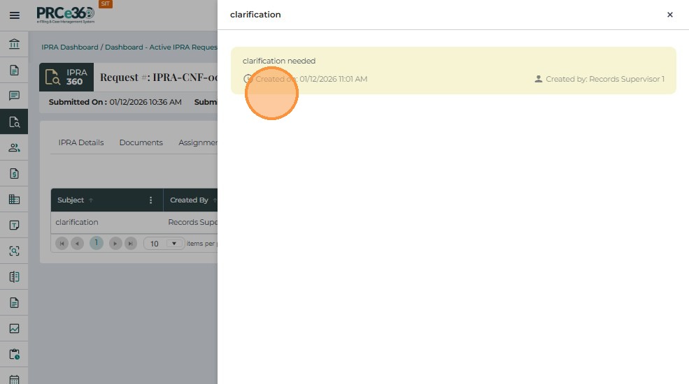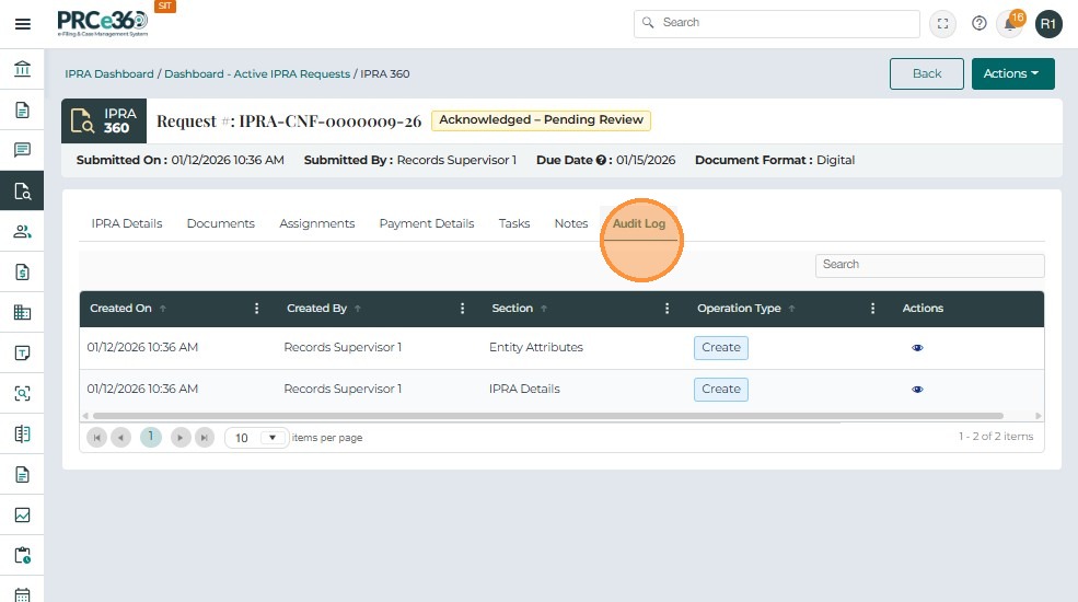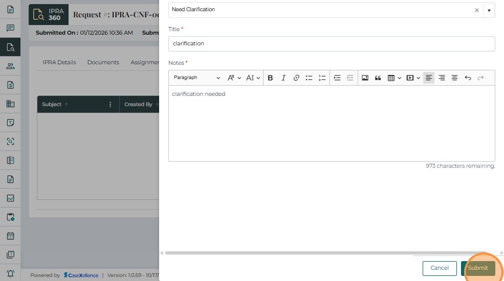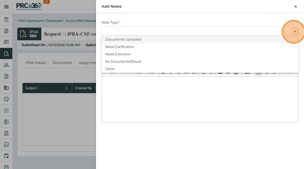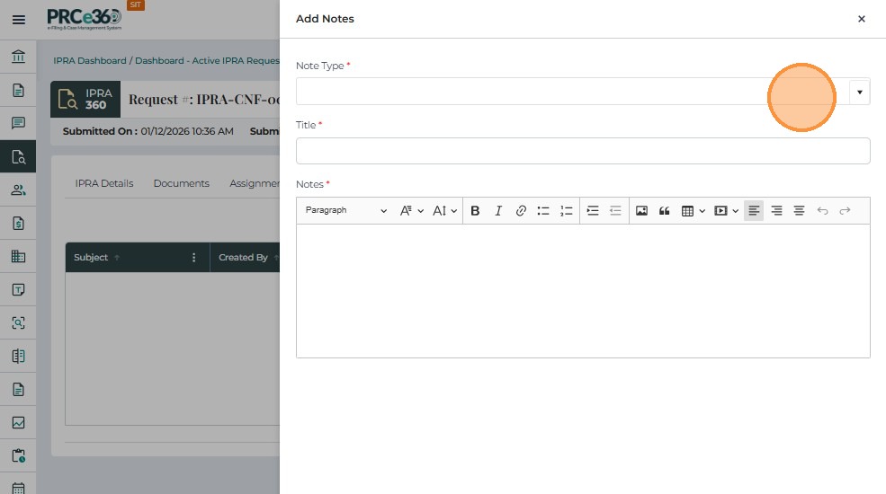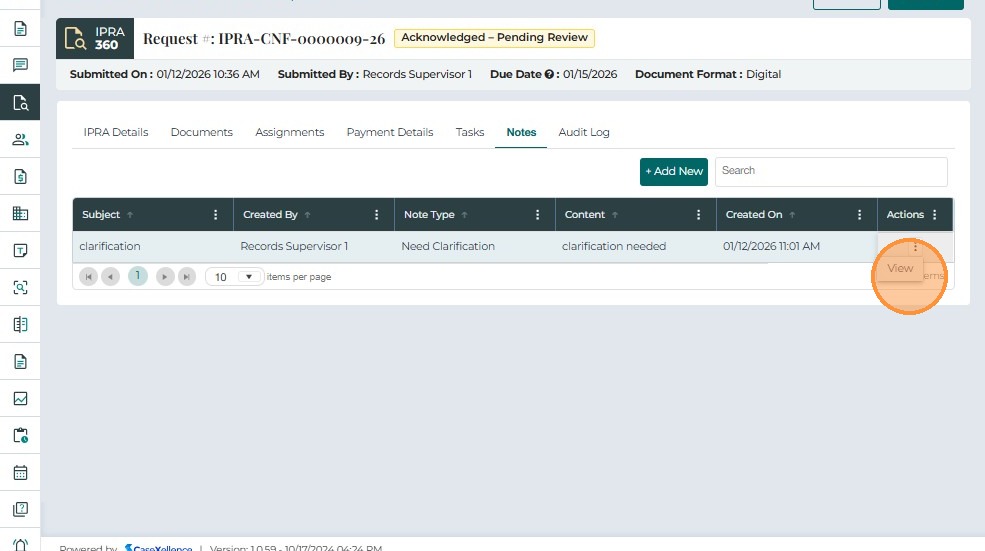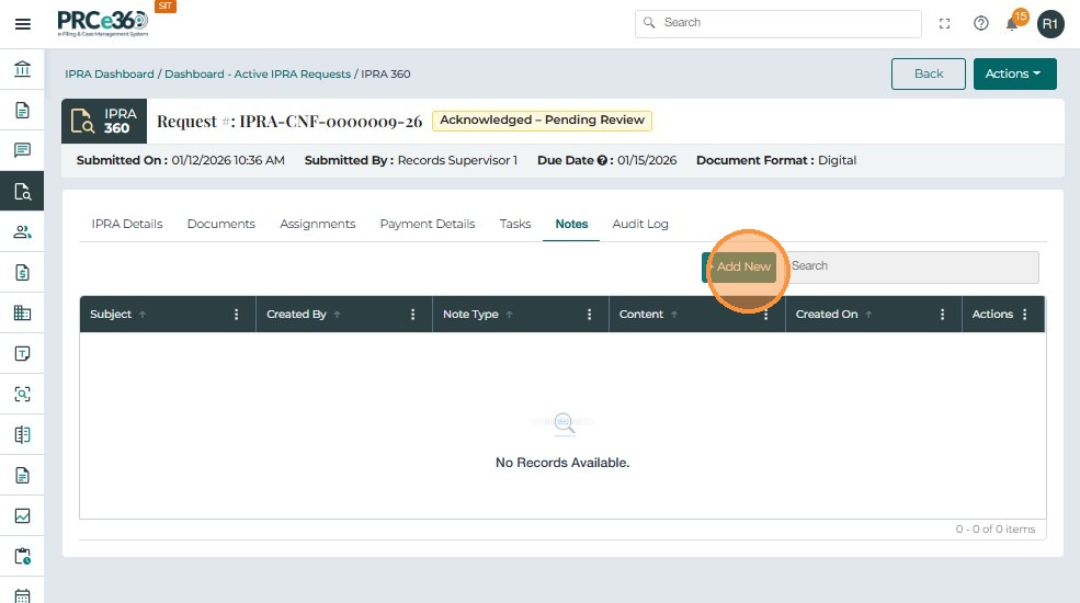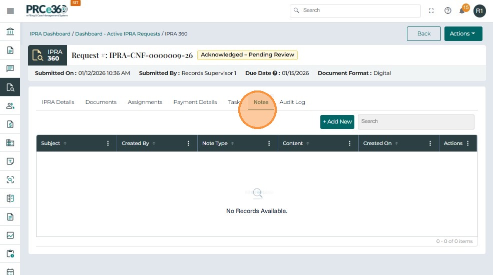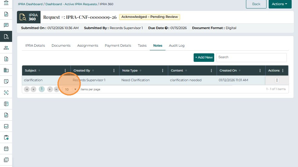 The Notes tab allows users to record comments, updates, and internal communication related to an IPRA request. This supports transparency and provides a complete historical record of decisions and actions.