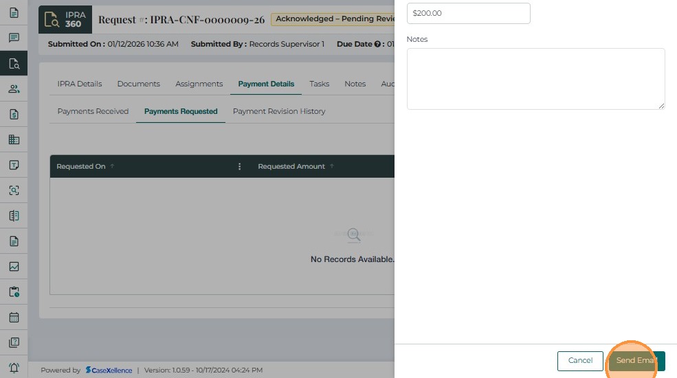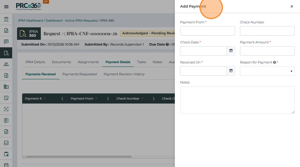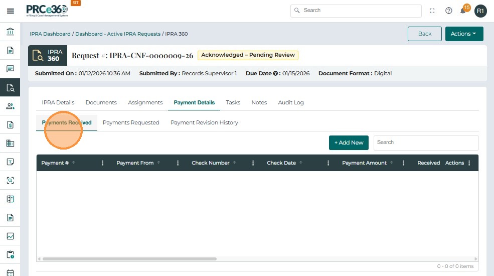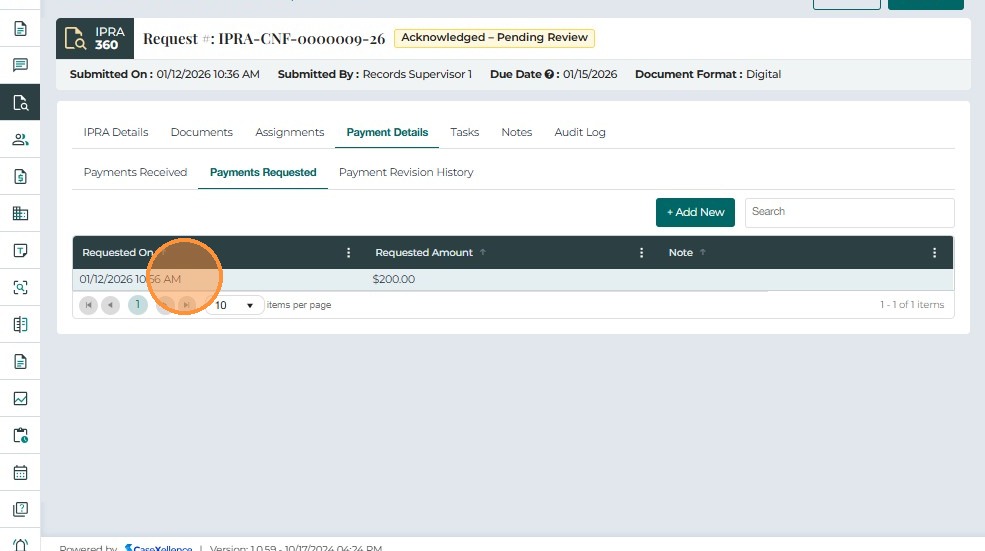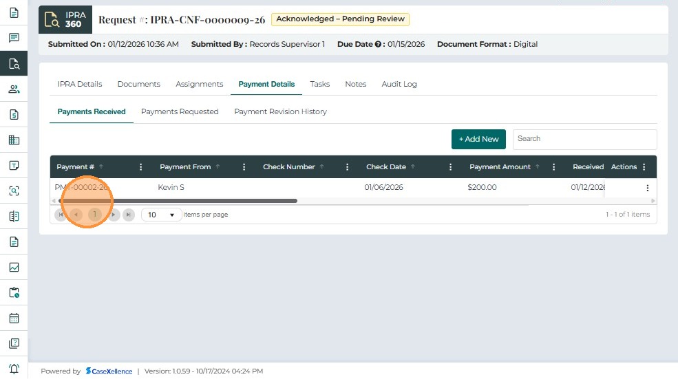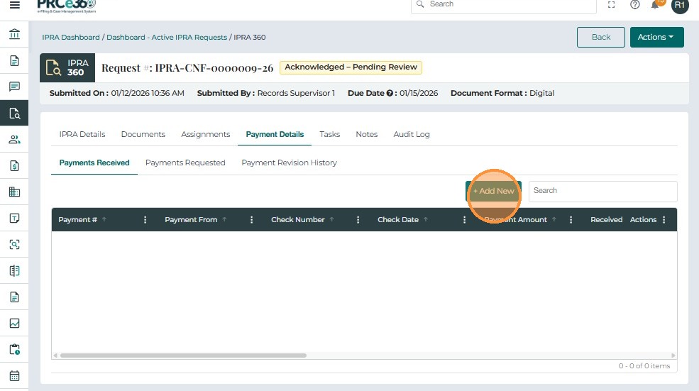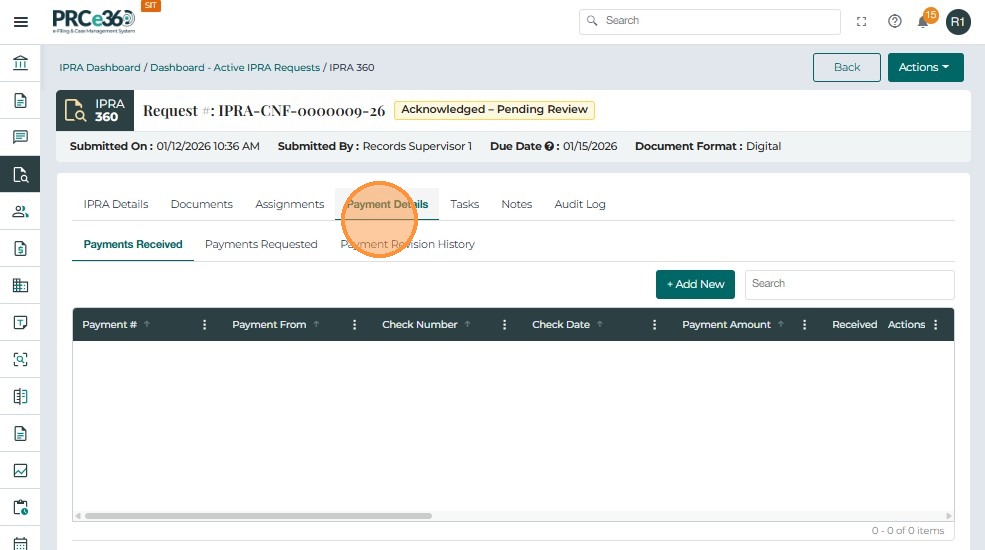 The Payment Details tab is used to record, track, and review all payments associated with an IPRA request. It ensures that no records are released until payment has been received and verified, in compliance with IPRA regulations.