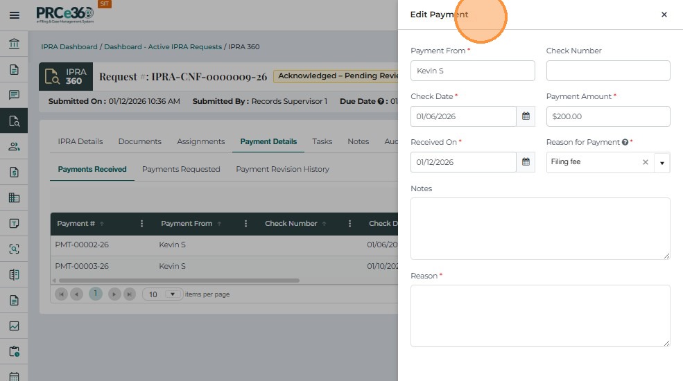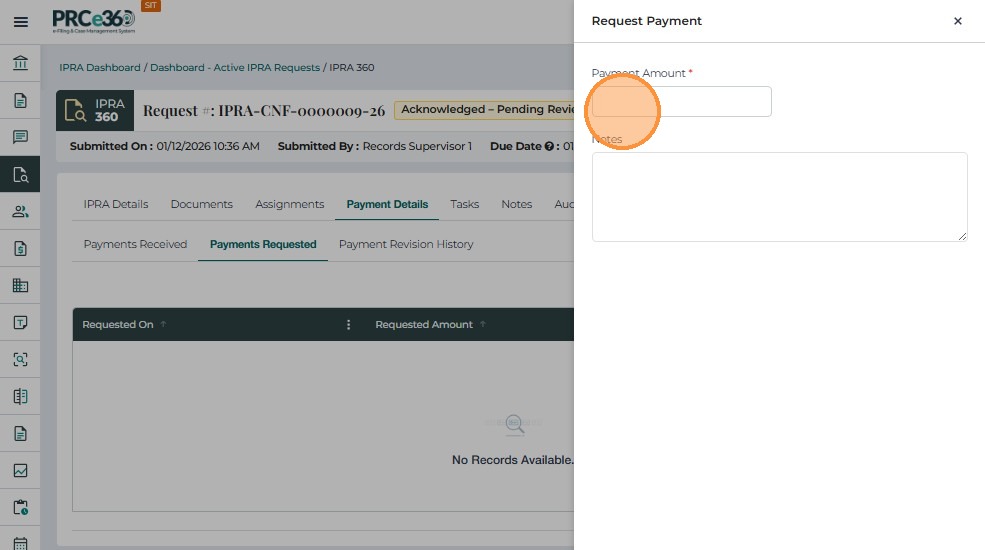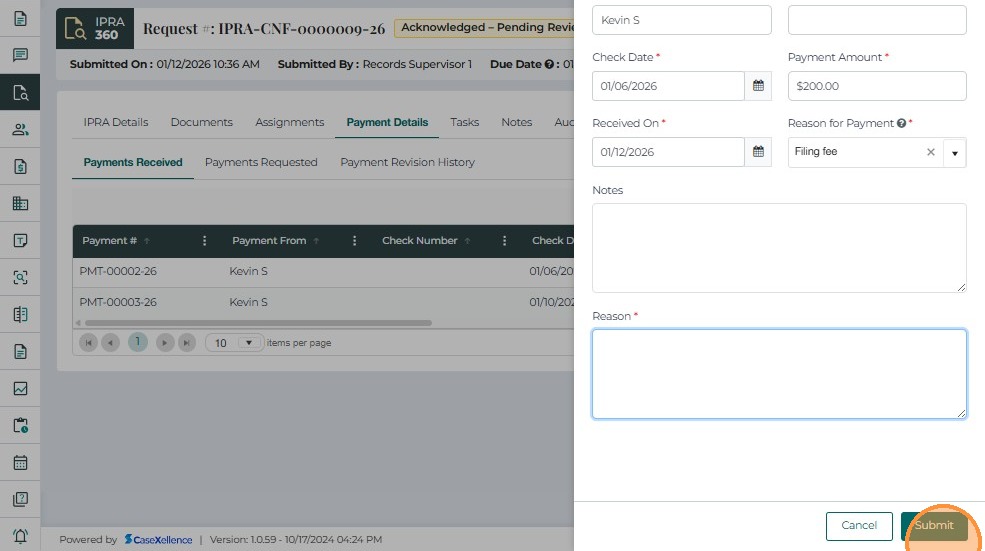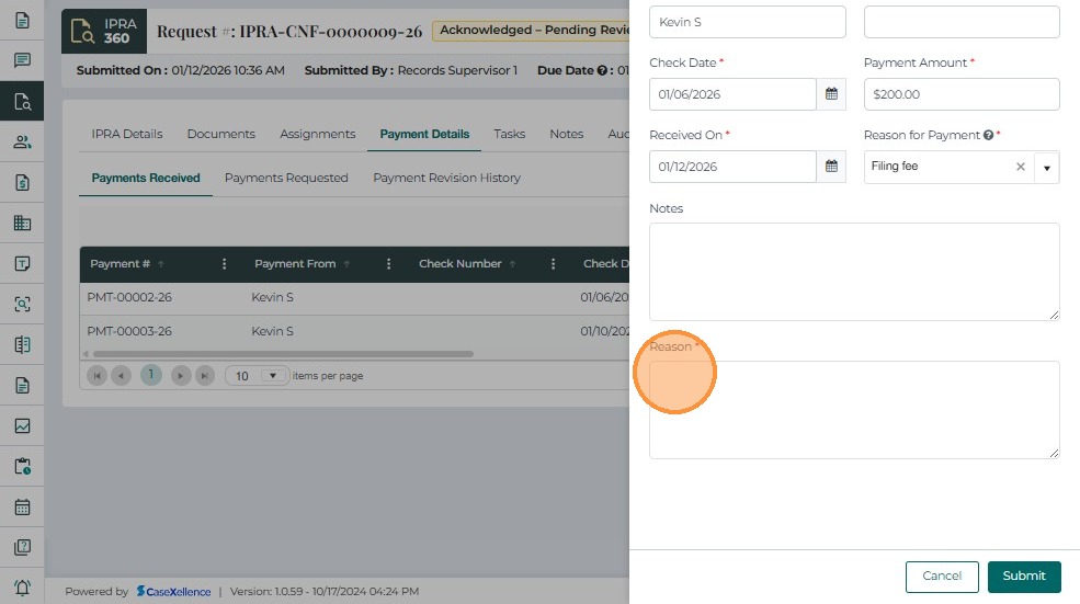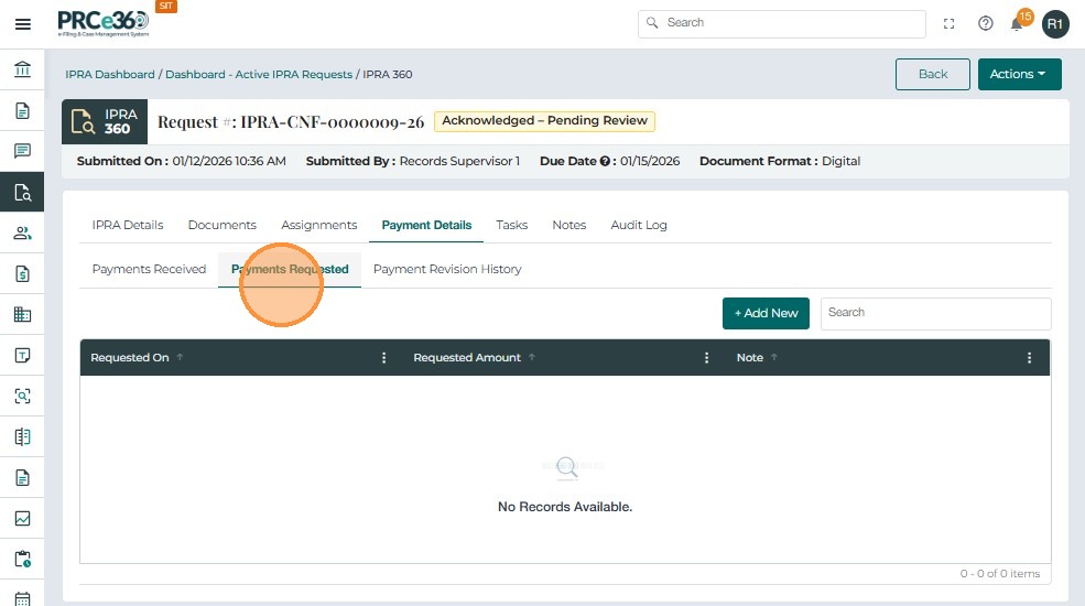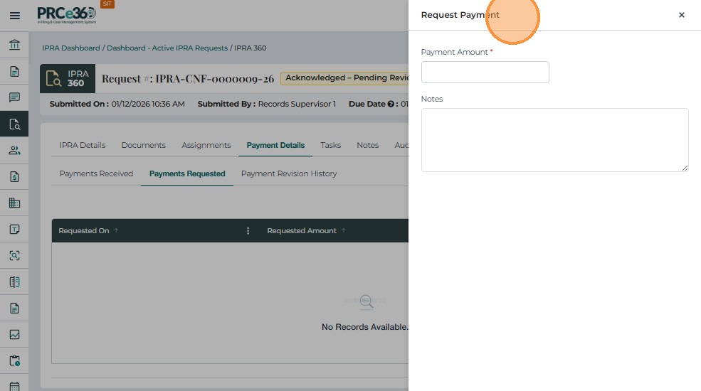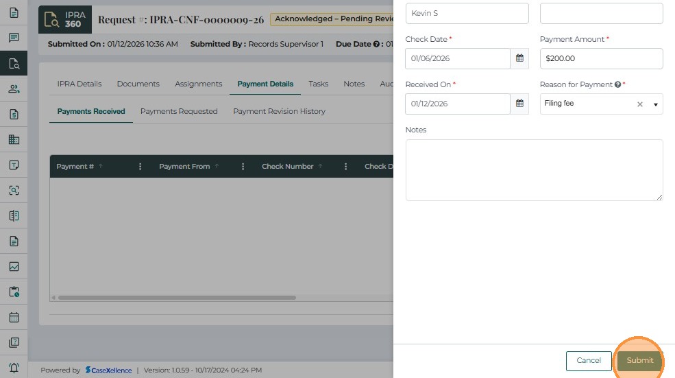 The Payment Details tab is used to record, track, and review all payments associated with an IPRA request. It ensures that no records are released until payment has been received and verified, in compliance with IPRA regulations.