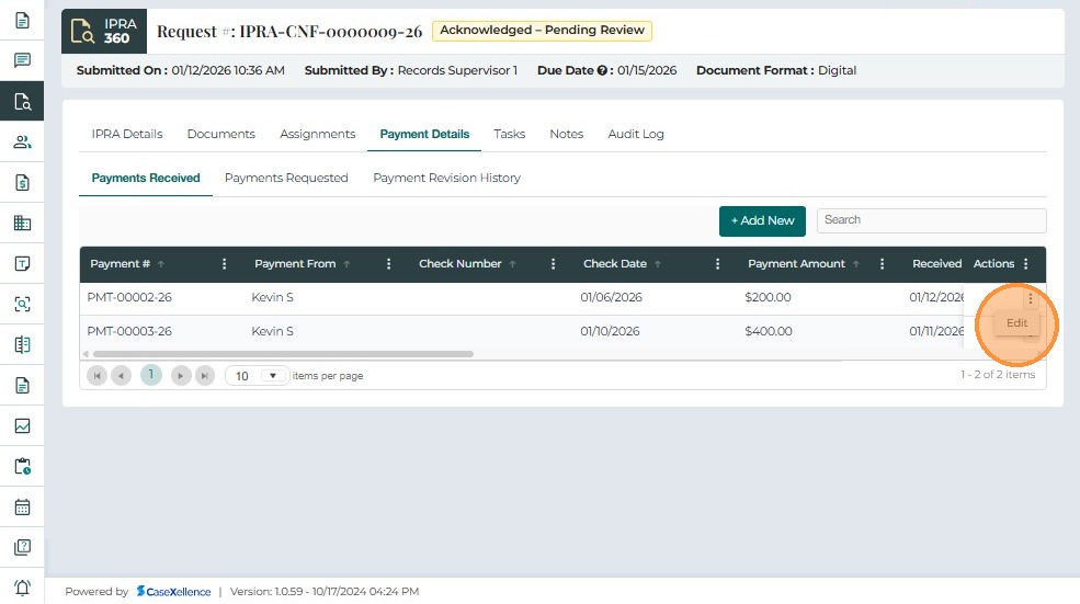 ActionsOption to Edit a payment entry. Edits are logged in Payment Revision History.