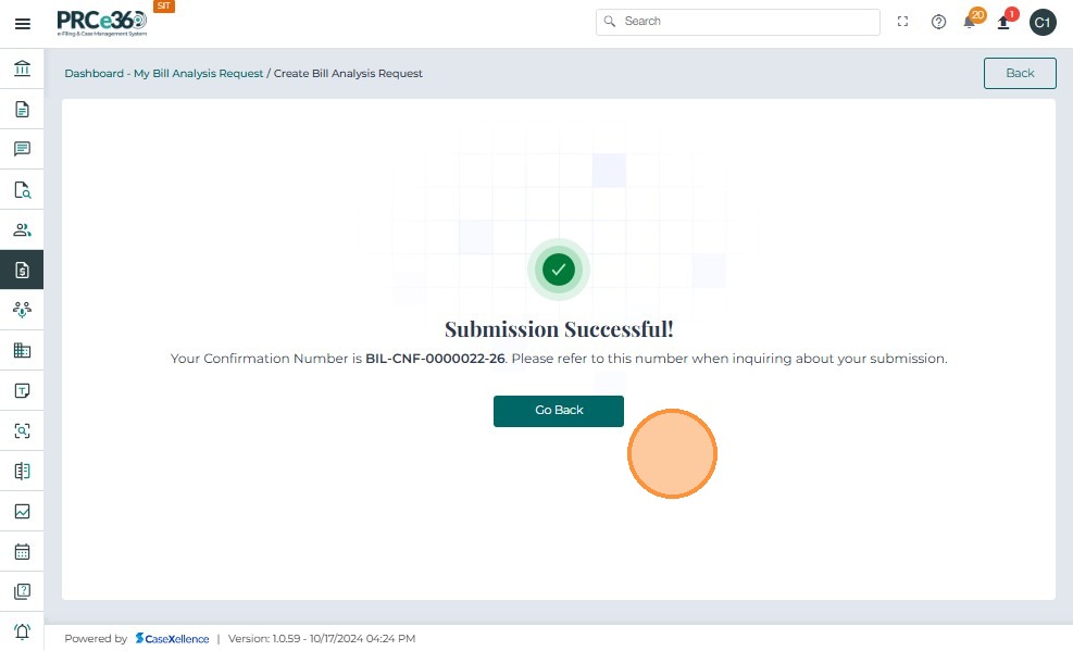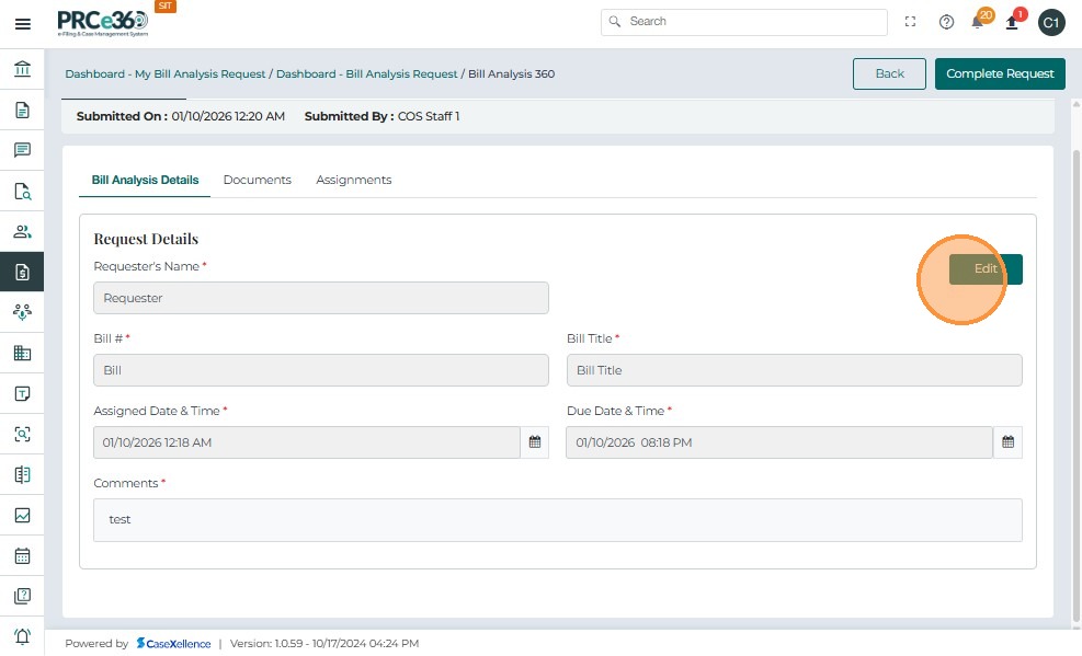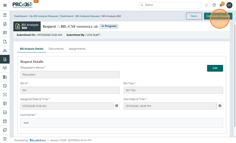 • On the Bill Analysis 360 page, click the Close Request button at the top-right of the screen.