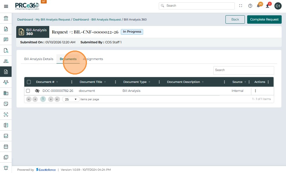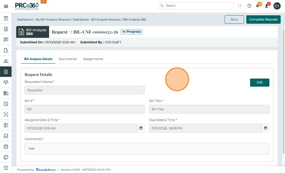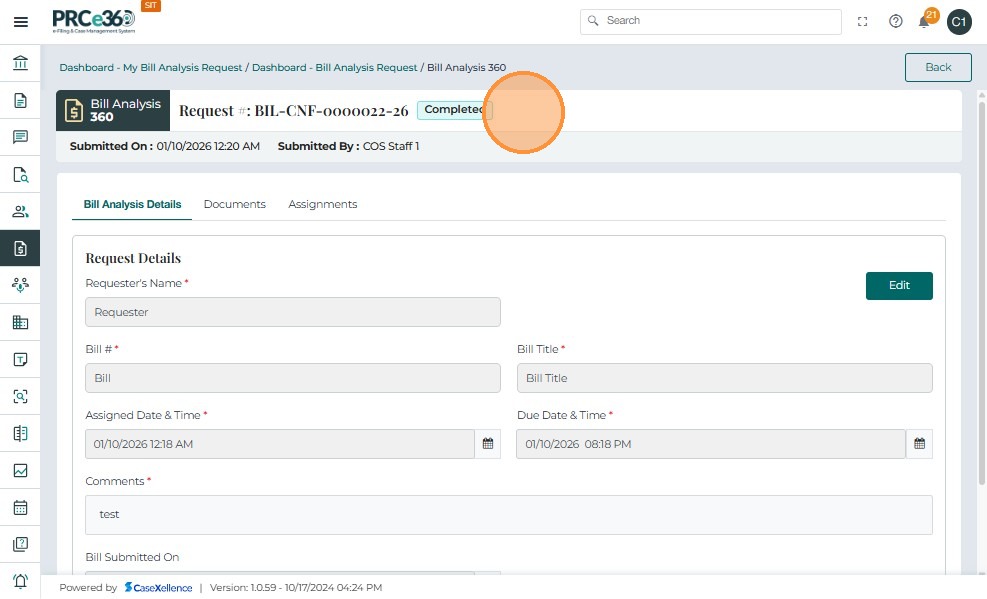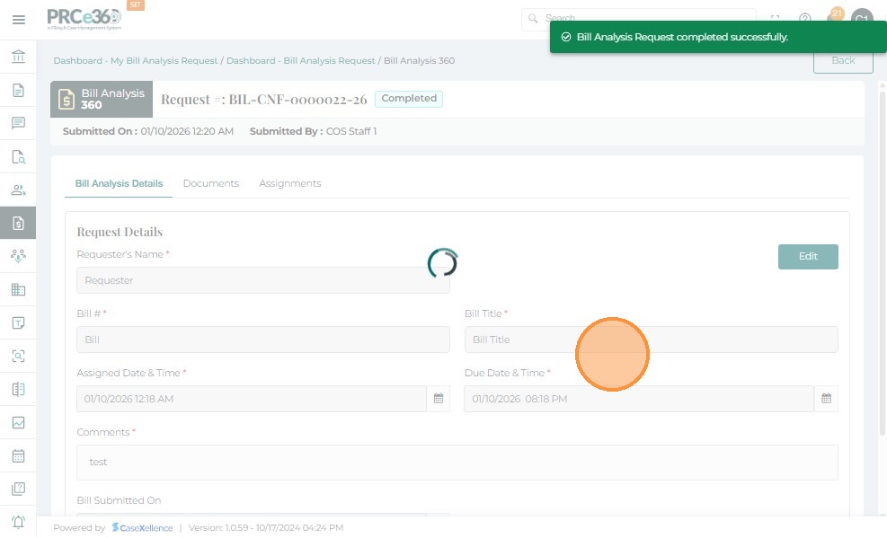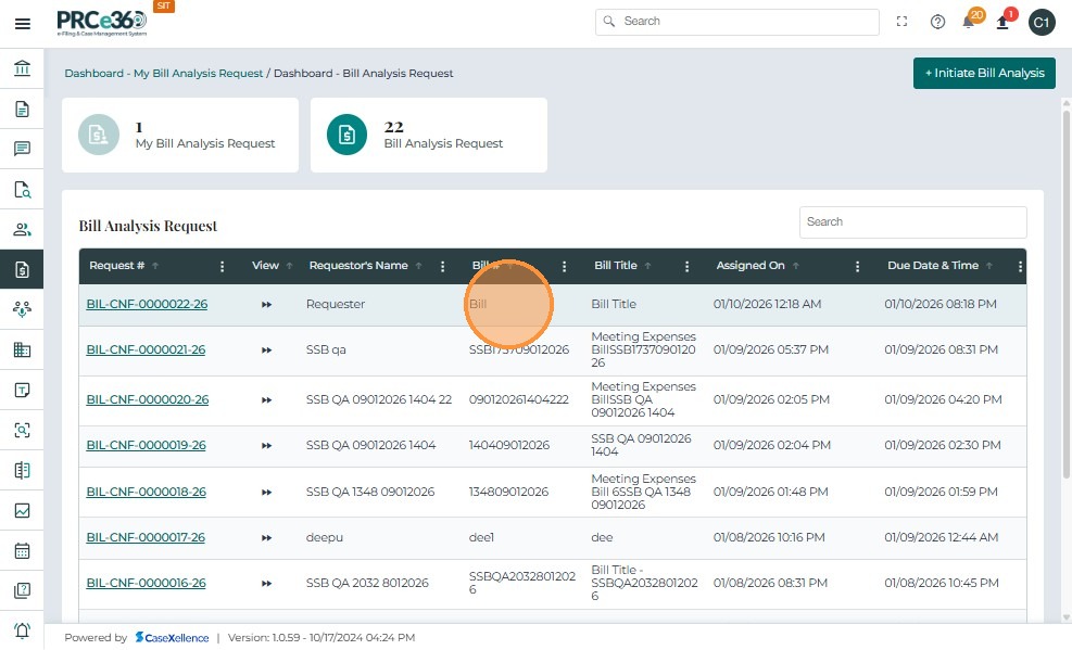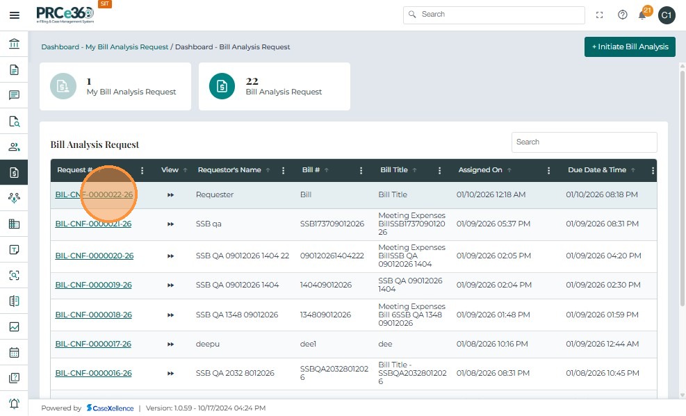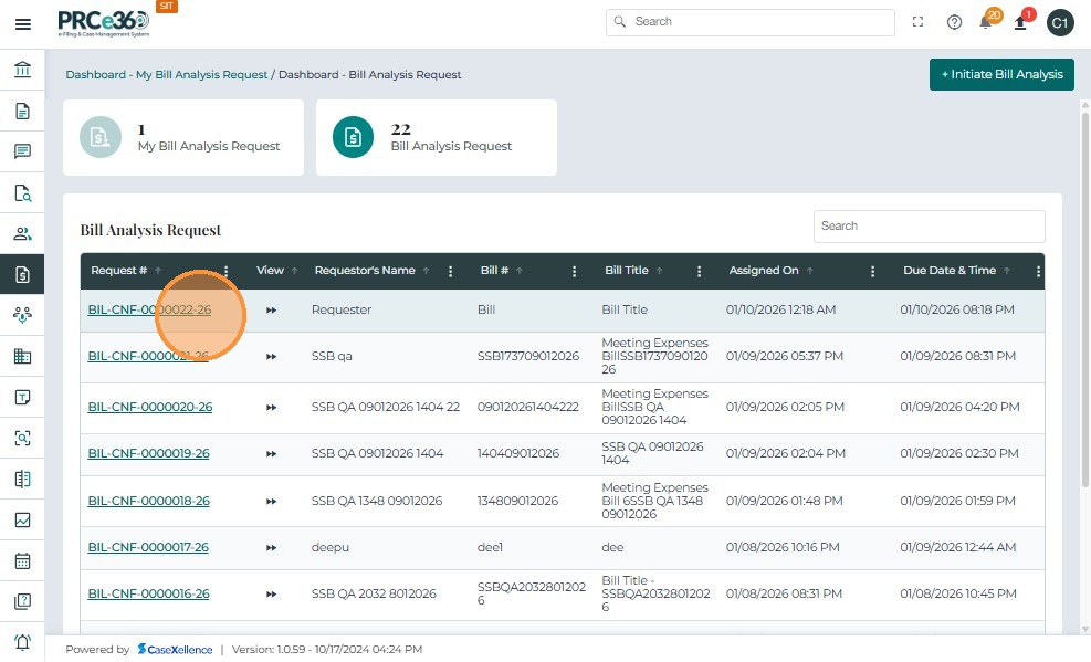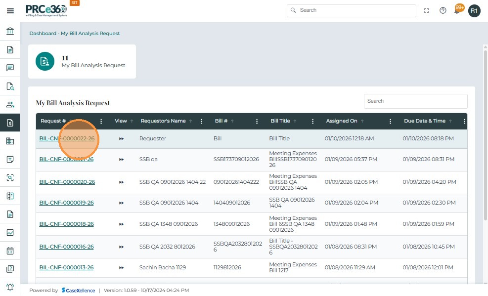 • From the Bill Analysis Dashboard, click the Request # (e.g., BIL-CNF-0000001-25) you want to close.
