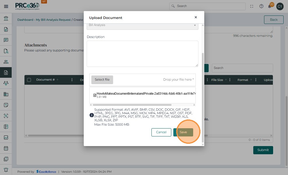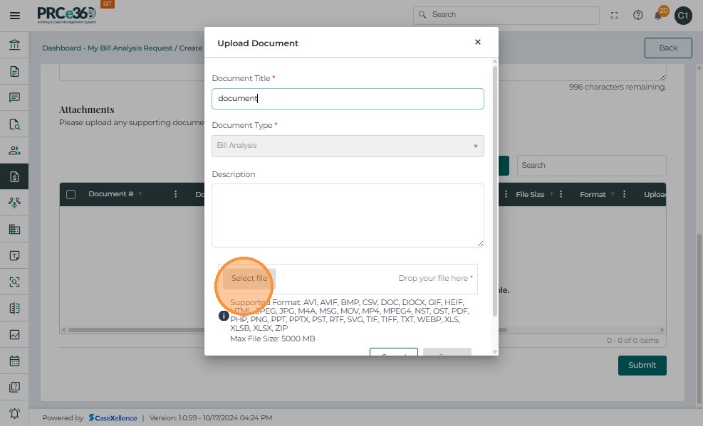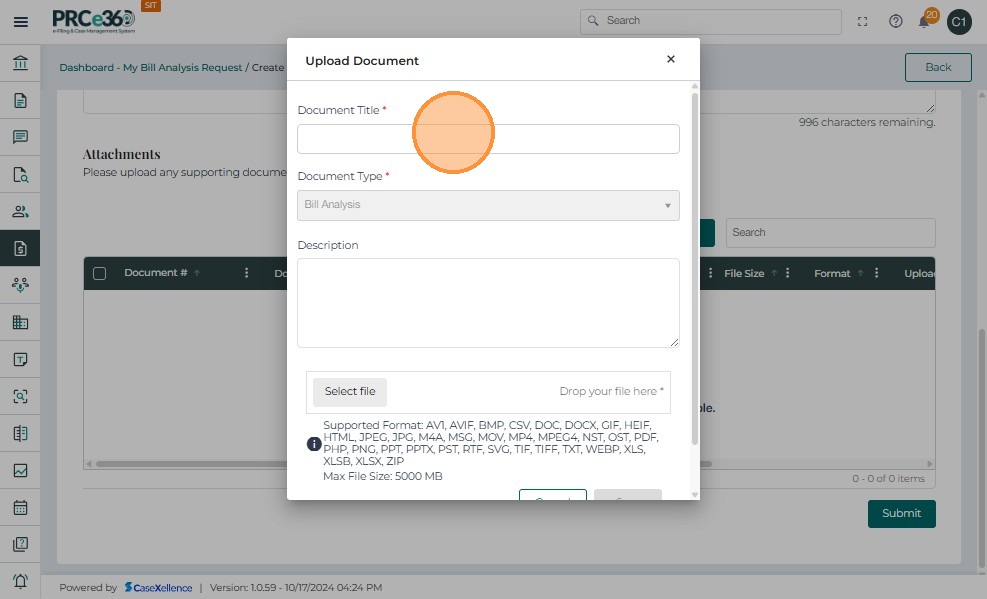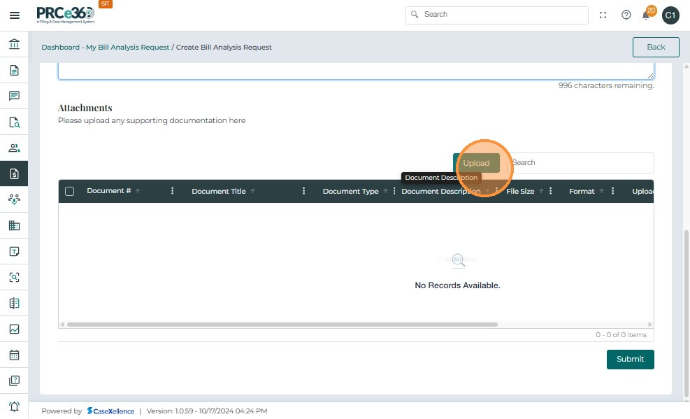 • Click Upload and complete the Document Title and Description fields.