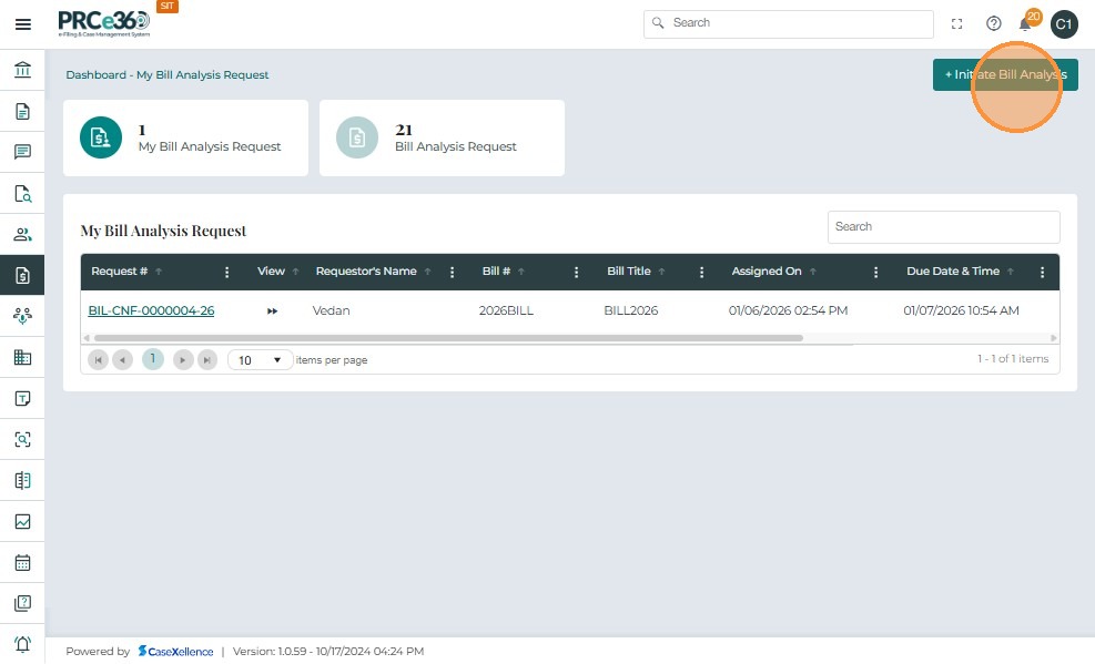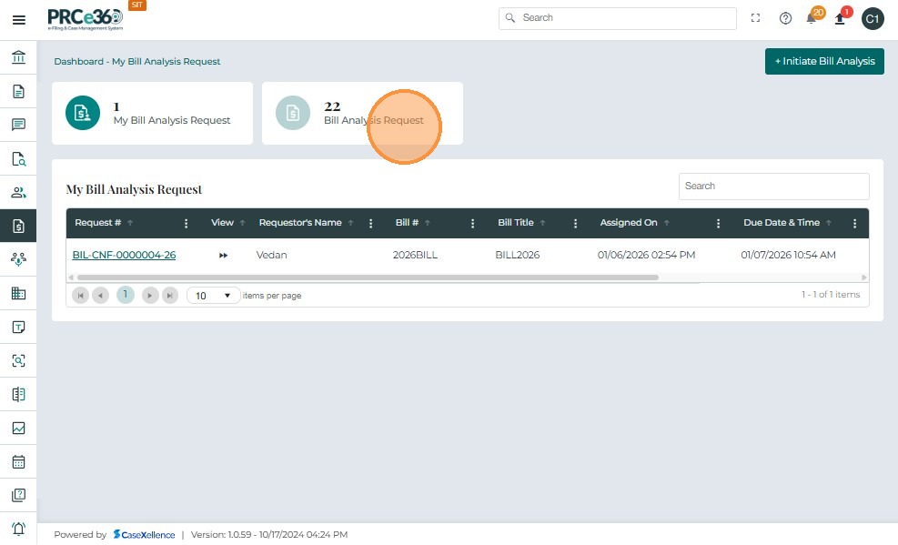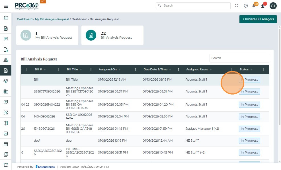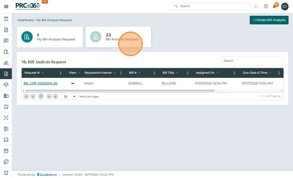 Once a Bill Analysis Request is submitted, it appears in the Bill Analysis Dashboard under the Bill Analysis Request queue.