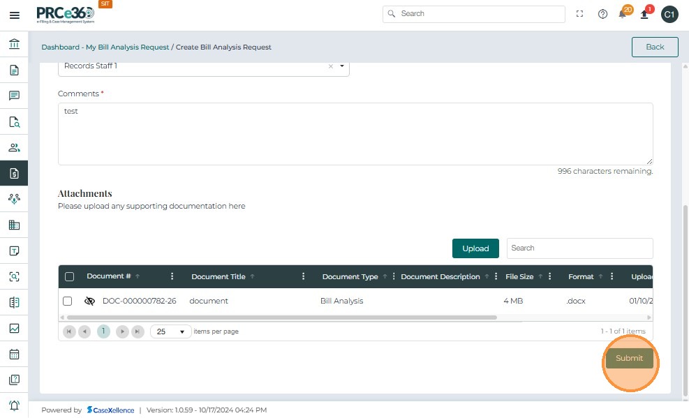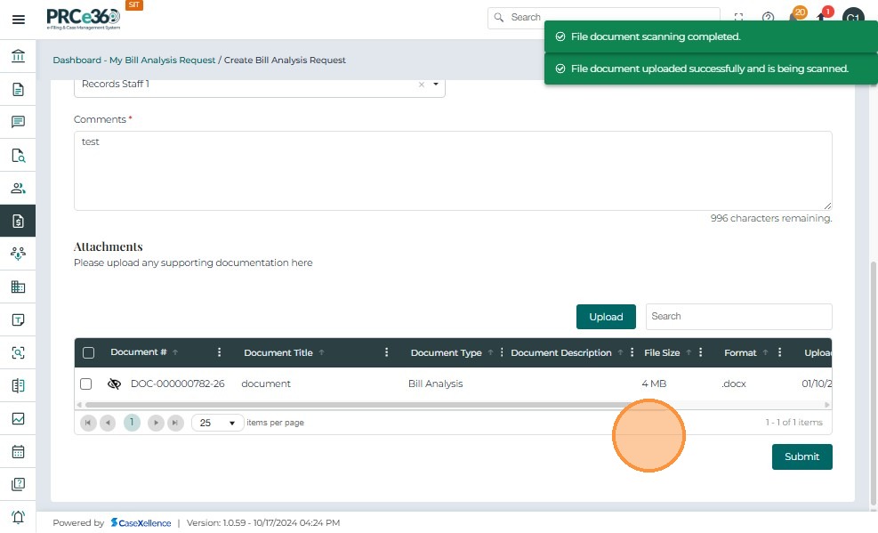• The system validates all required fields and attachments.