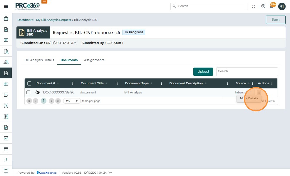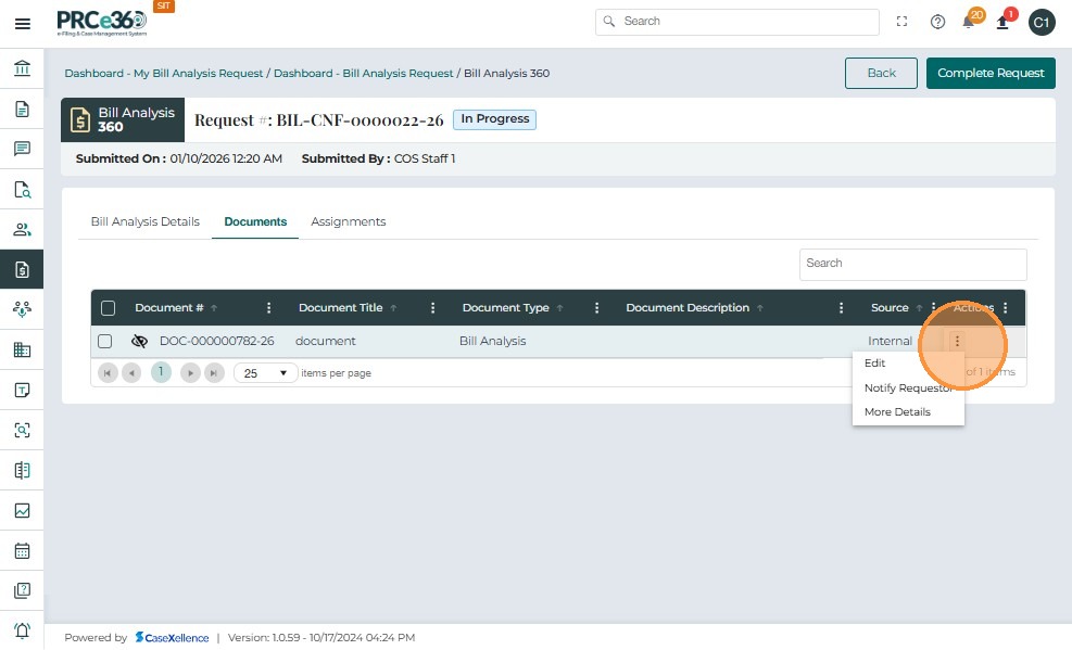 • Once the completed Bill Analysis document is uploaded, click the three-dot icon under the Actions column.