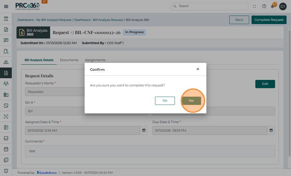 Once the assigned staff has completed the bill analysis and the final document has been reviewed, the COS Supervisor or COS Staff can close the request to mark it as completed in the system.