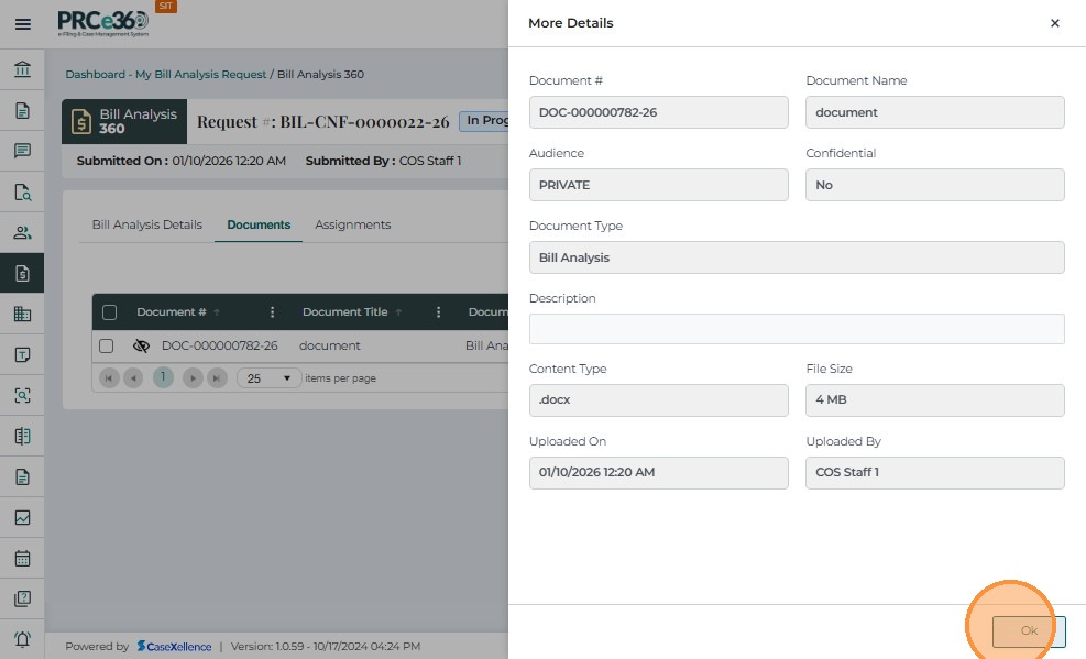 Users can review details of any uploaded Bill Analysis document, including metadata such as upload date, file type, and uploader.