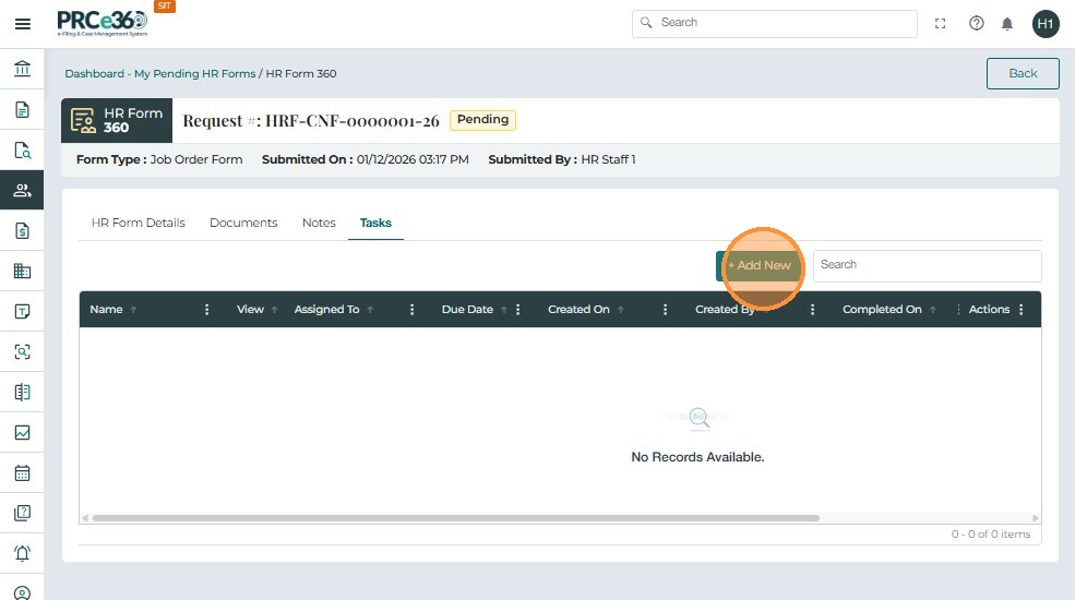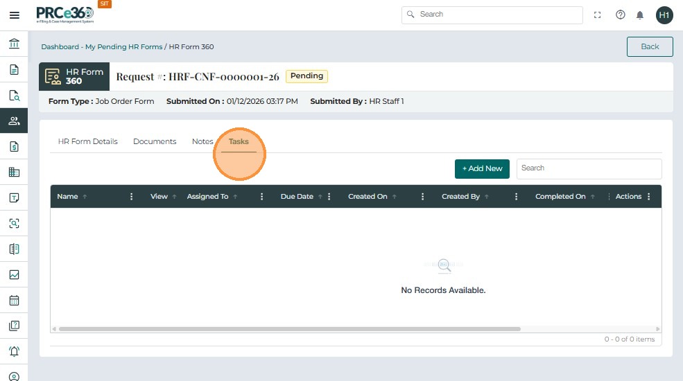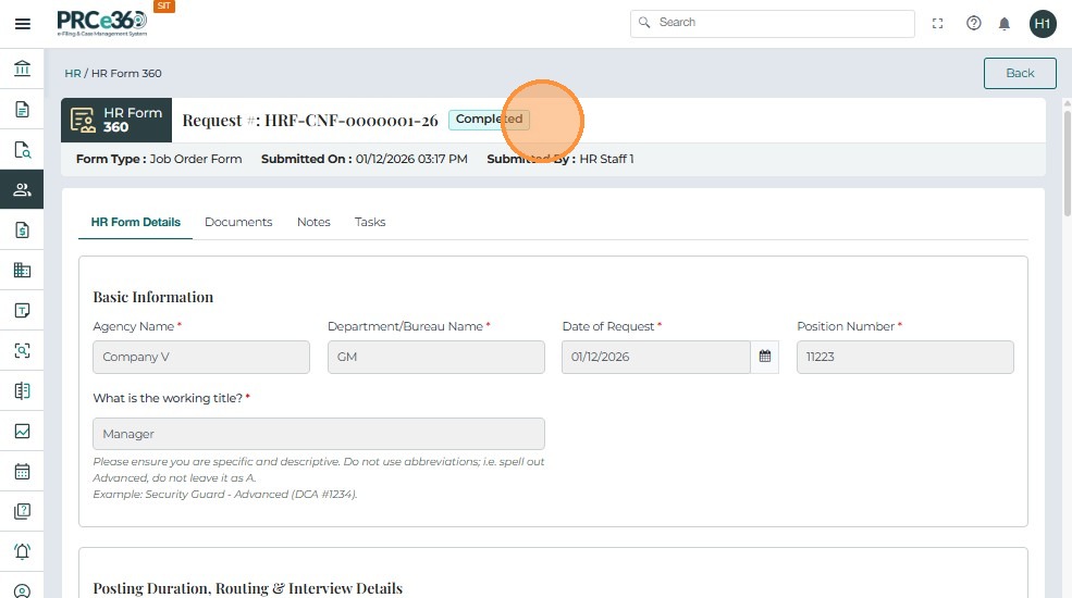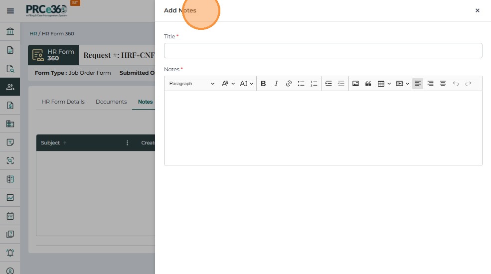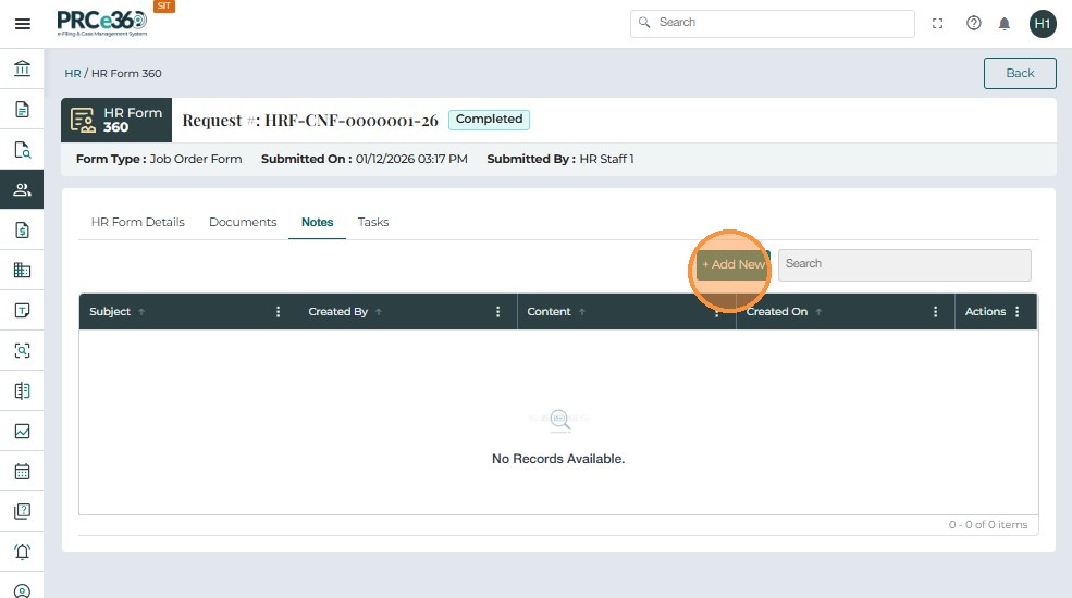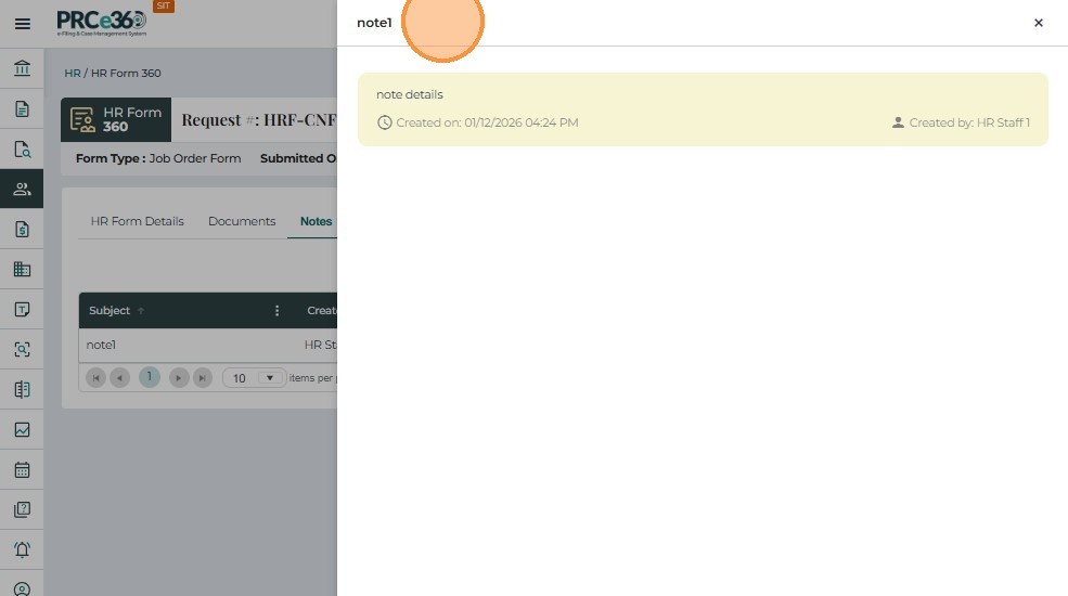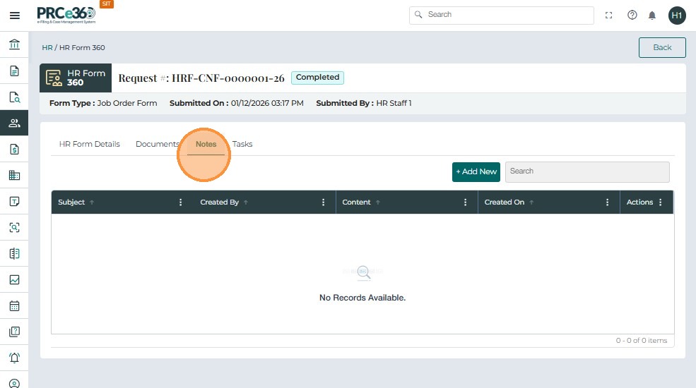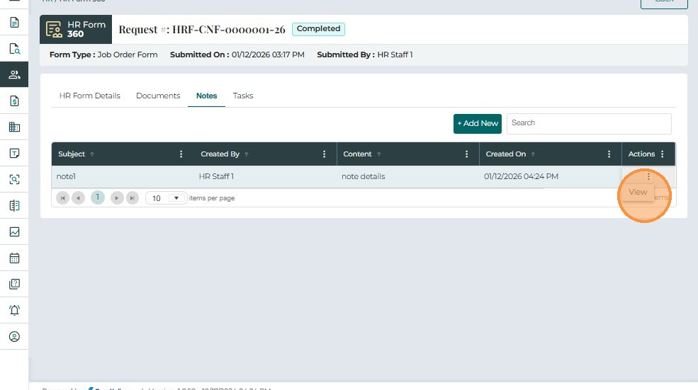 - Open the Notes tab in the completed HR Form to view the list of all notes added to the form.