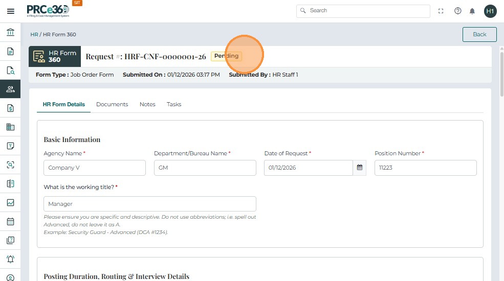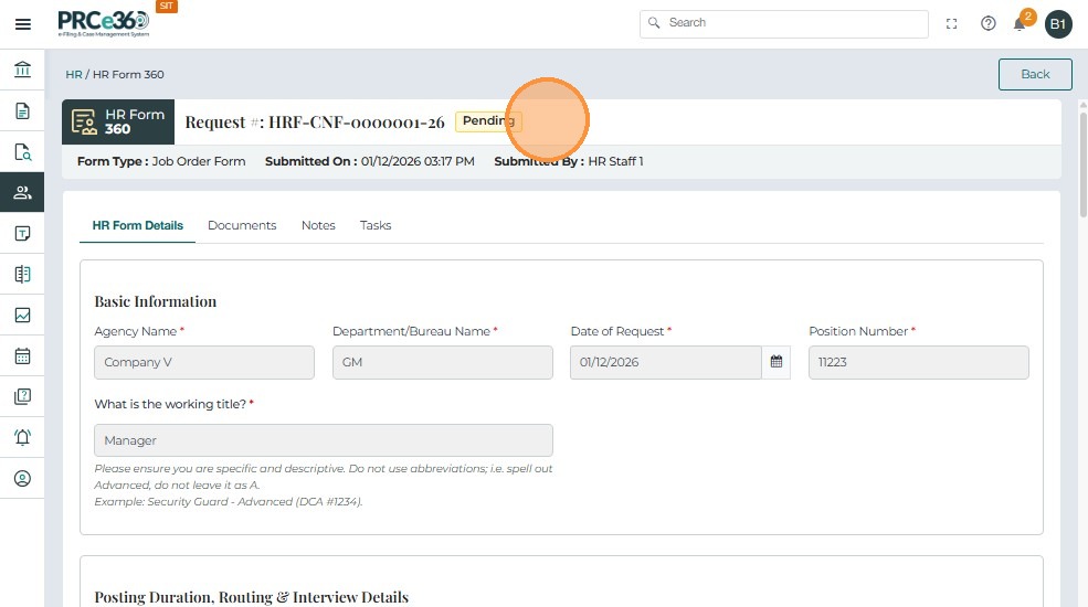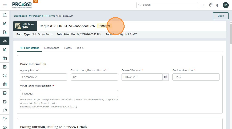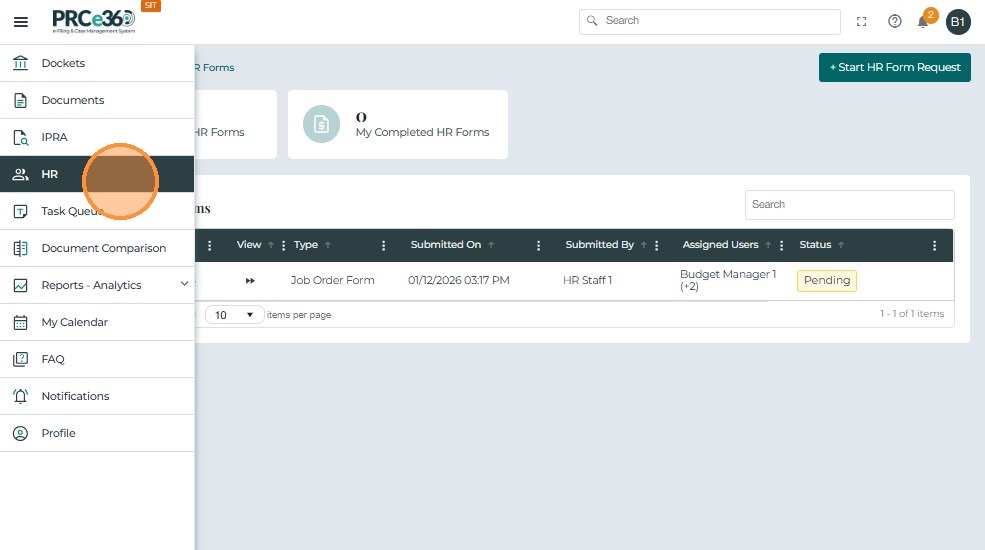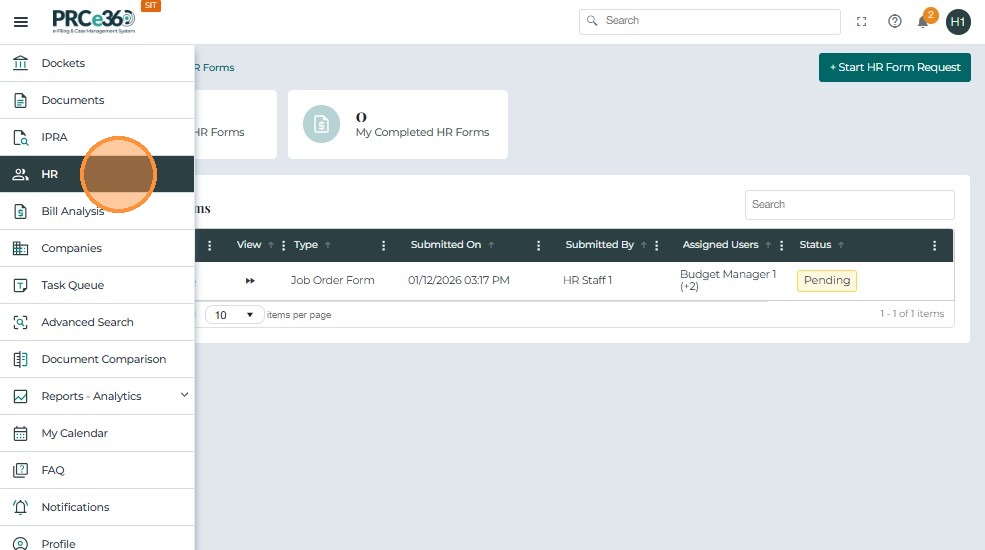 After saving the Job Order Form, it appears in the My Pending HR Forms queue.