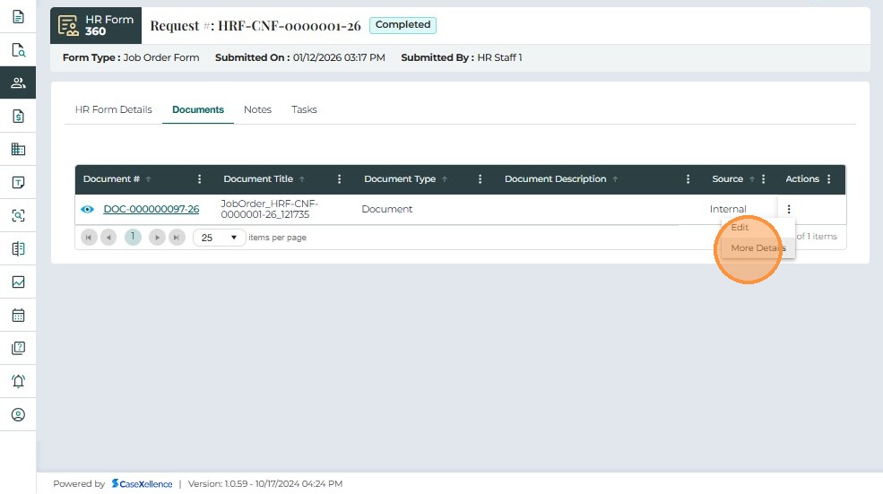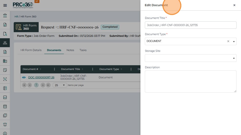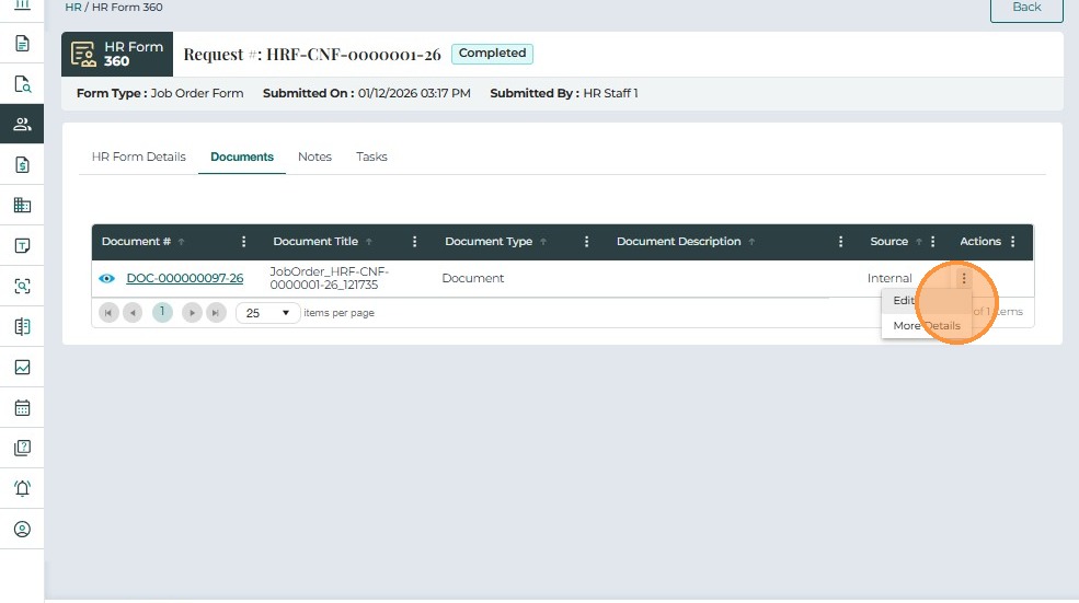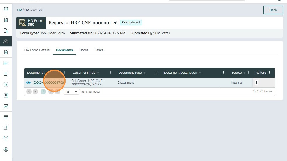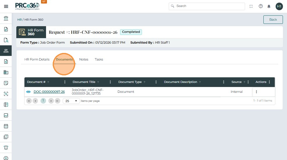 - The system returns you to the Documents tab of the HR Form 360 page.