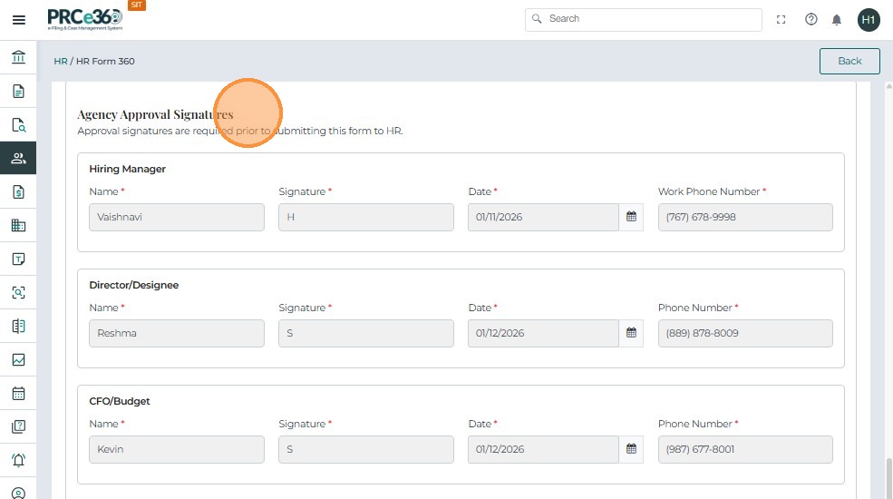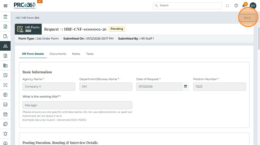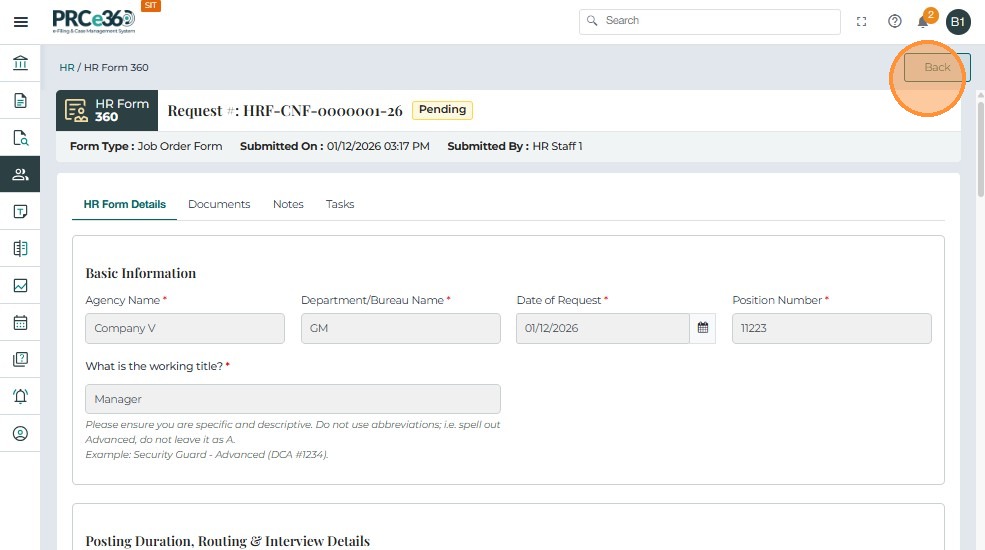 Click the Back button at the top-right corner to return to the My Pending HR Forms dashboard.