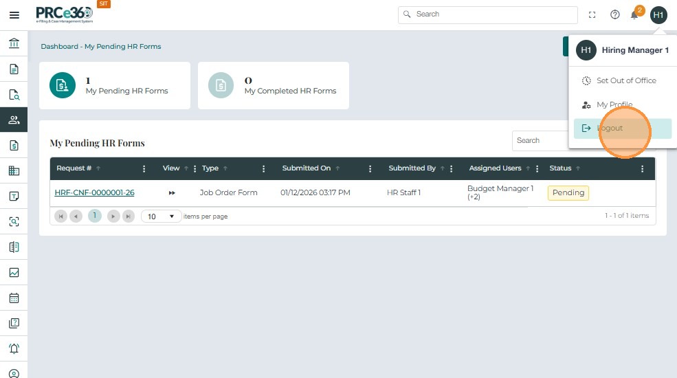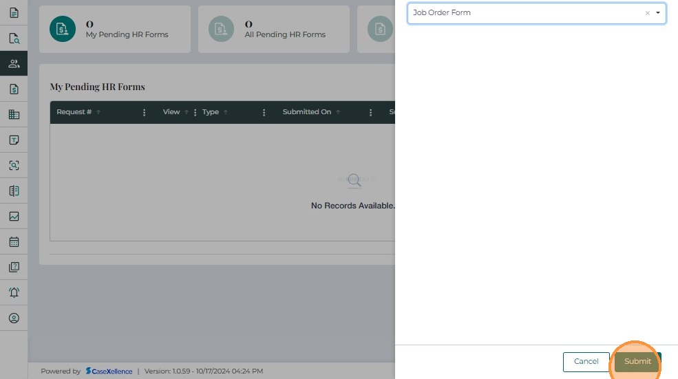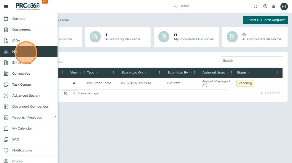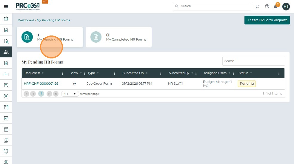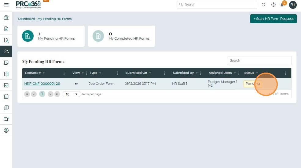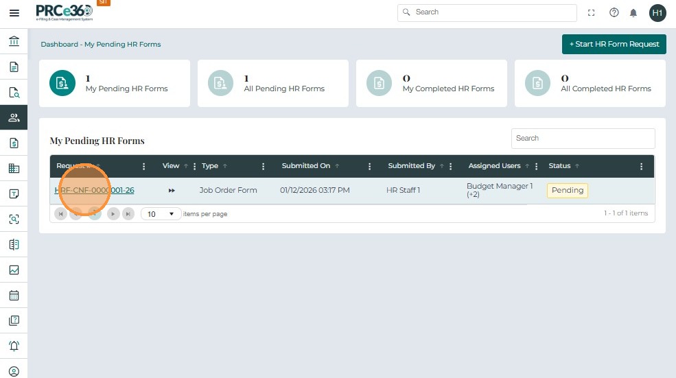 - Under My Pending HR Forms, locate the Job Order Form with Pending status.