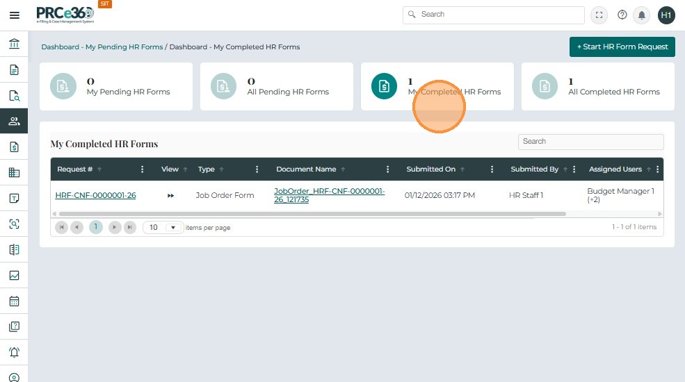 - On the HR dashboard, click My Completed HR Forms to view all HR form requests that have been processed and completed for the logged-in HR Staff user.