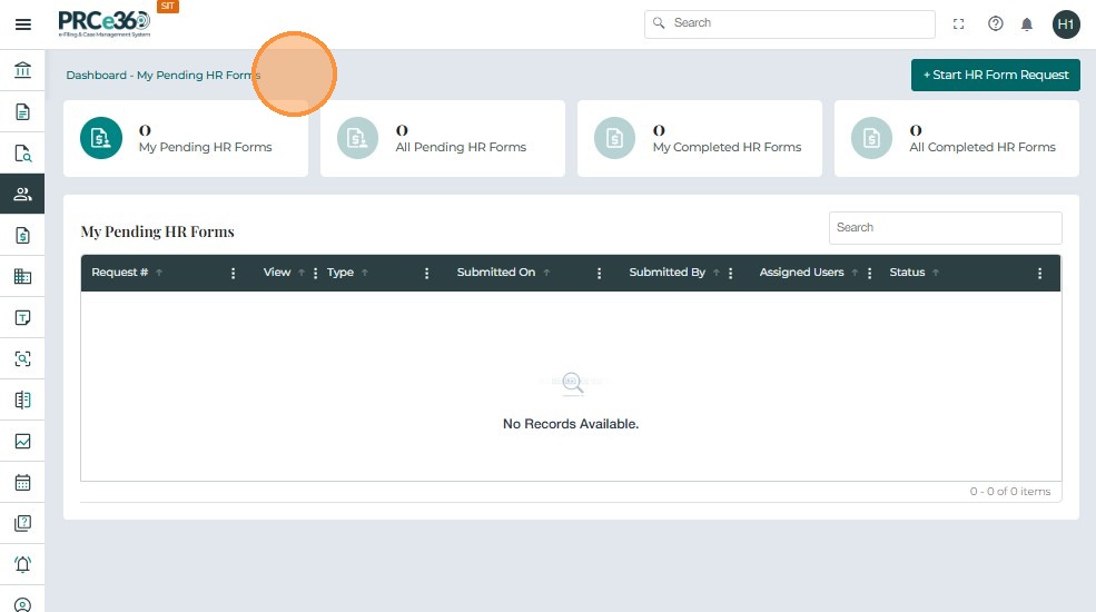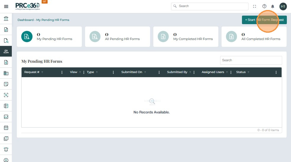 - In the top-right corner of the HR Dashboard, click + Start HR Form Request.