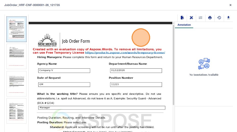 The Job Order Form is the official HR request used to initiate and manage job postings and position approvals at the New Mexico Public Regulation Commission (NMPRC). The form enforces a consistent, auditable workflow by assigning specific pages and fields to the appropriate roles. This ensures that HR, Hiring Managers, and Budget Managers each contribute the information required for a complete and compliant job request.