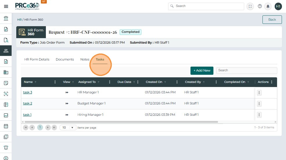 - The Tasks tab displays all users assigned to the HR Form, including their: