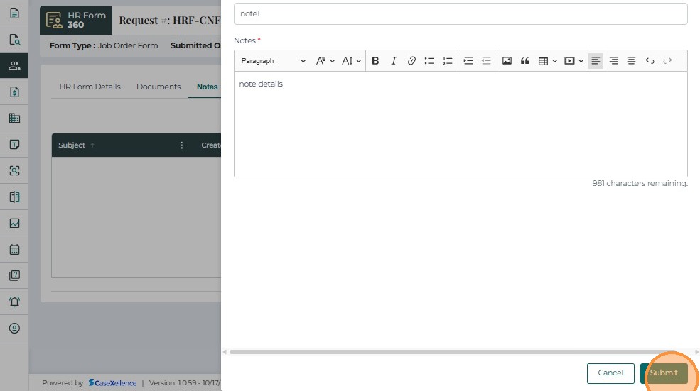 - After entering the Title and Note text, click Submit to save the new note to the HR Form.