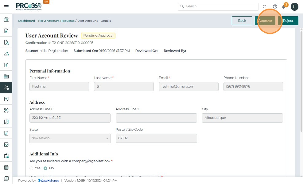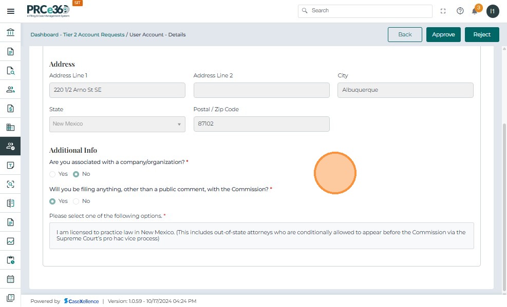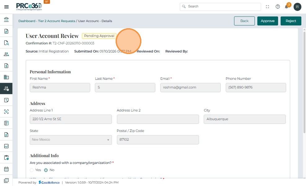 In the Public Portal, only Tier 2 user registrations require approval by the PRC IT/Admin team. When a user indicates during registration that they will be filing items other than public comments with the Commission (by answering Yes to the designated registration question), the system identifies them as a potential Tier 2 user. Their account is then set to Pending Approval and routed to the Account Access queue for review.