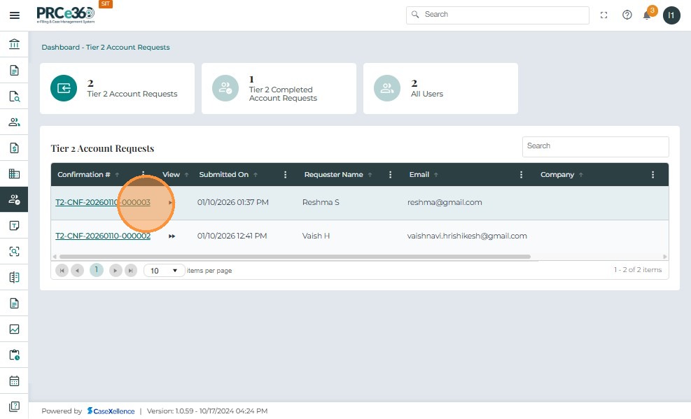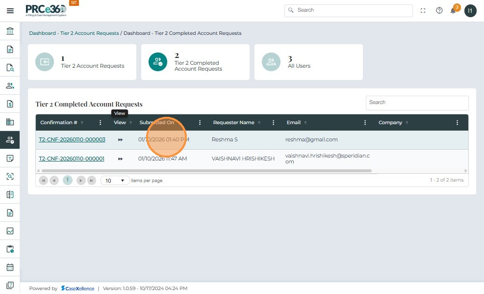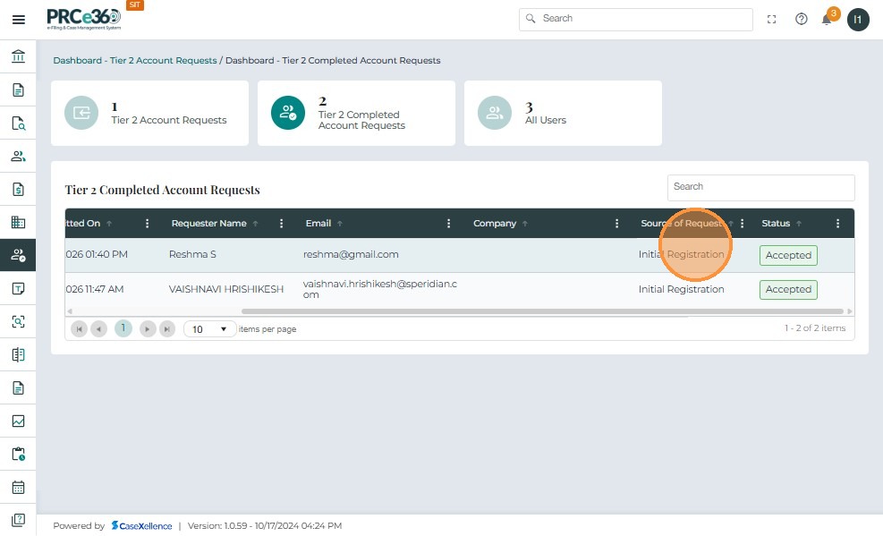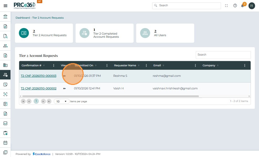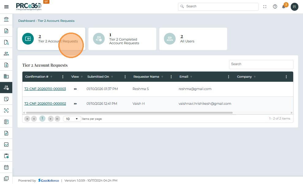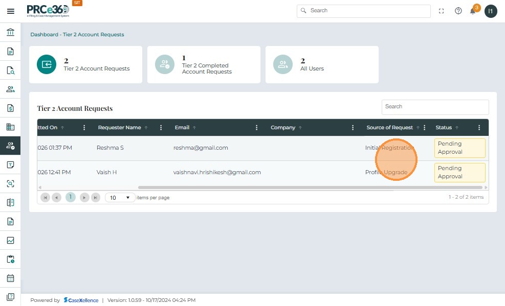 In the Tier 2 Account Requests table, browse the list of pending submissions.