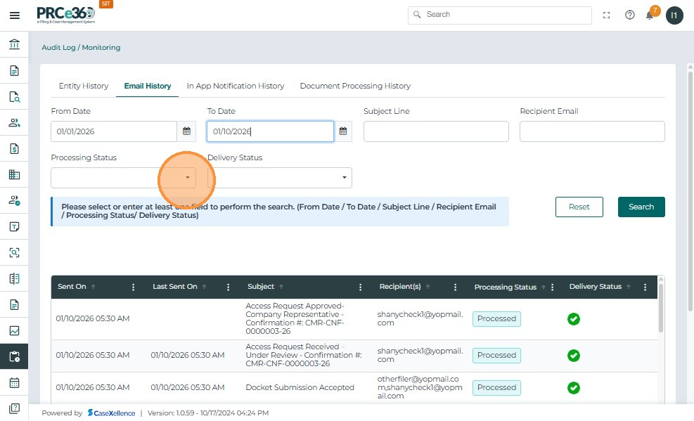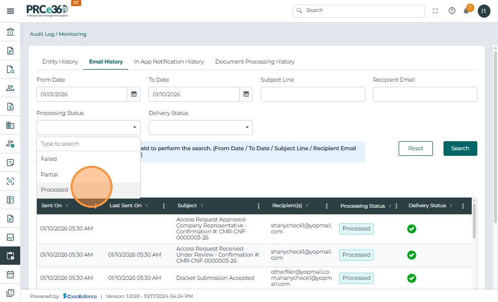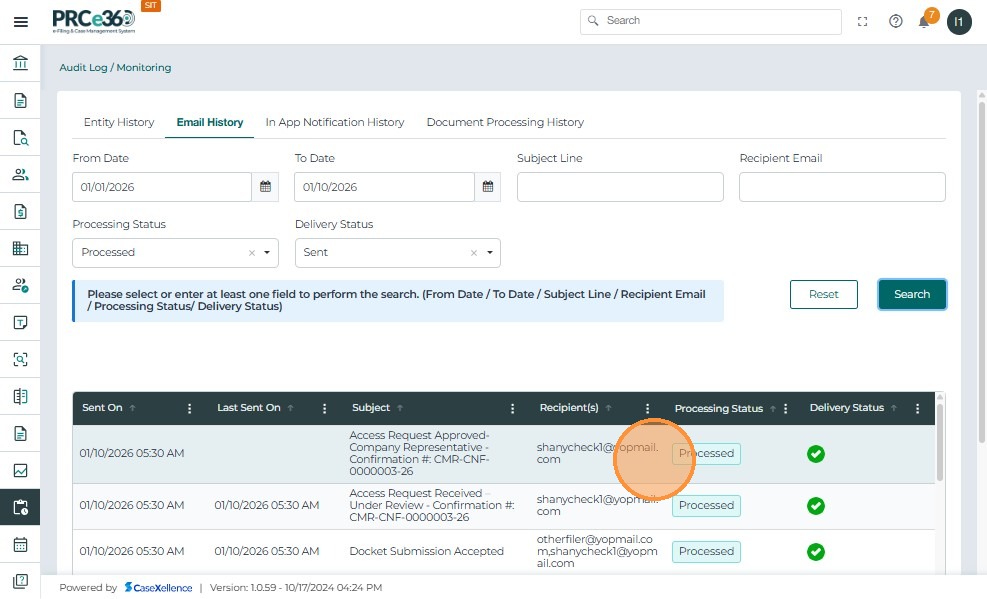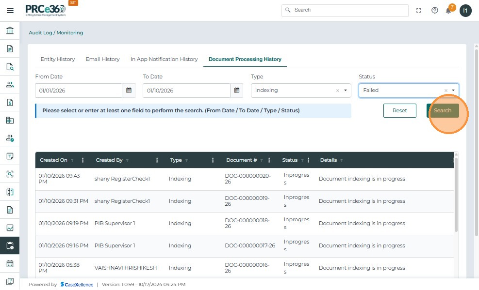 - Review the filtered document processing records displayed in the results table.