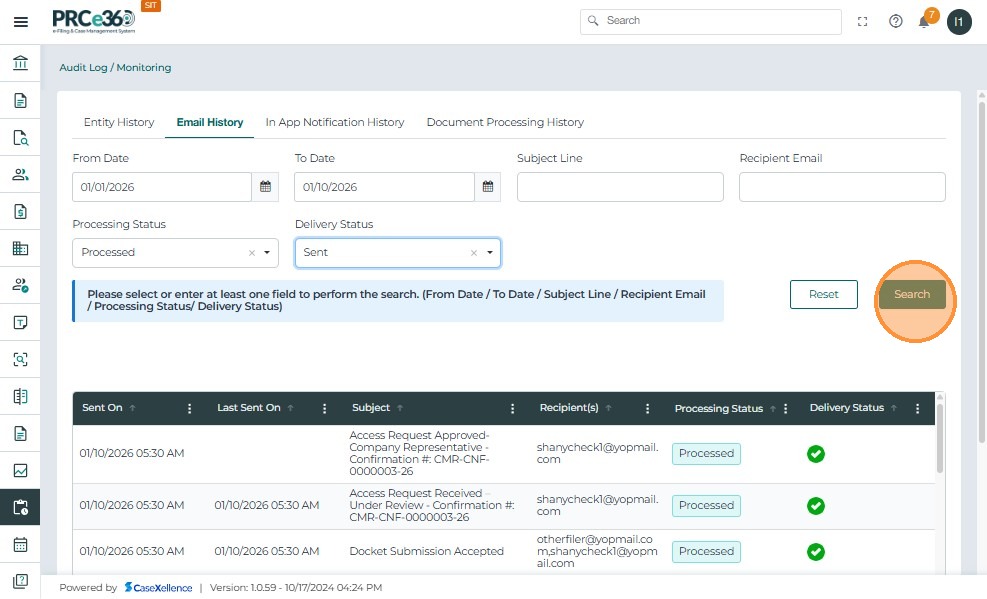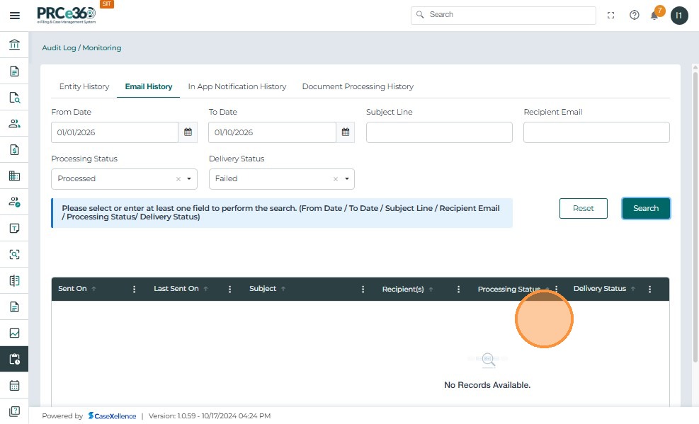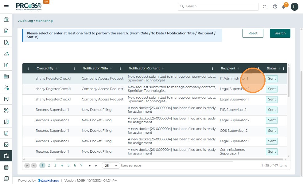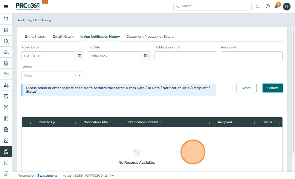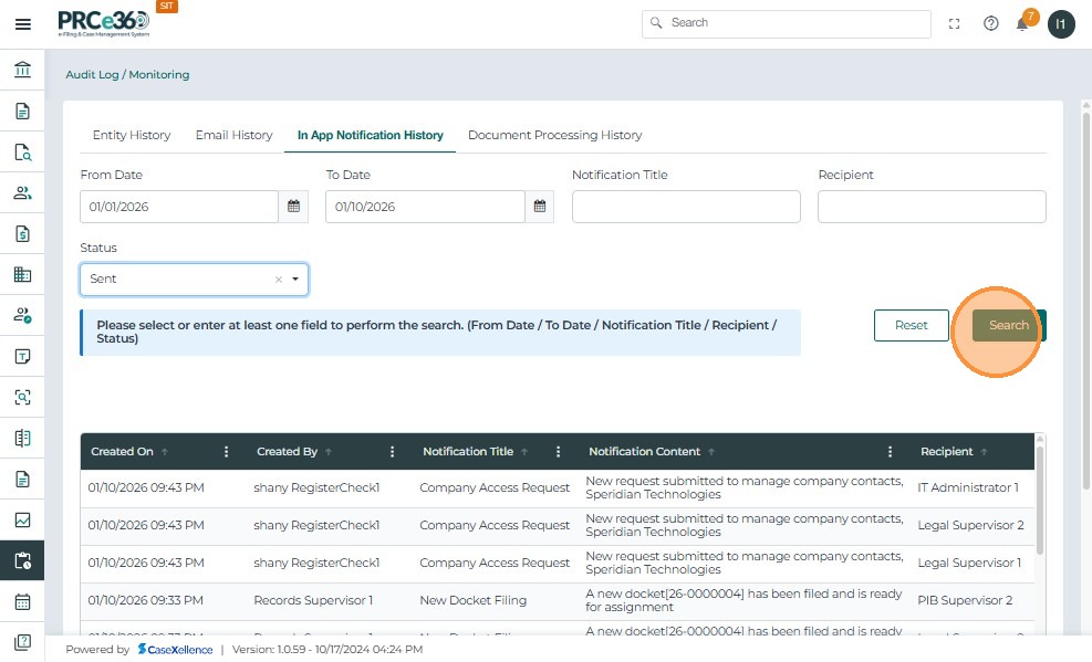 Click Search: The system retrieves all matching notifications based on the selected filters. The filtered results are displayed in the table below.