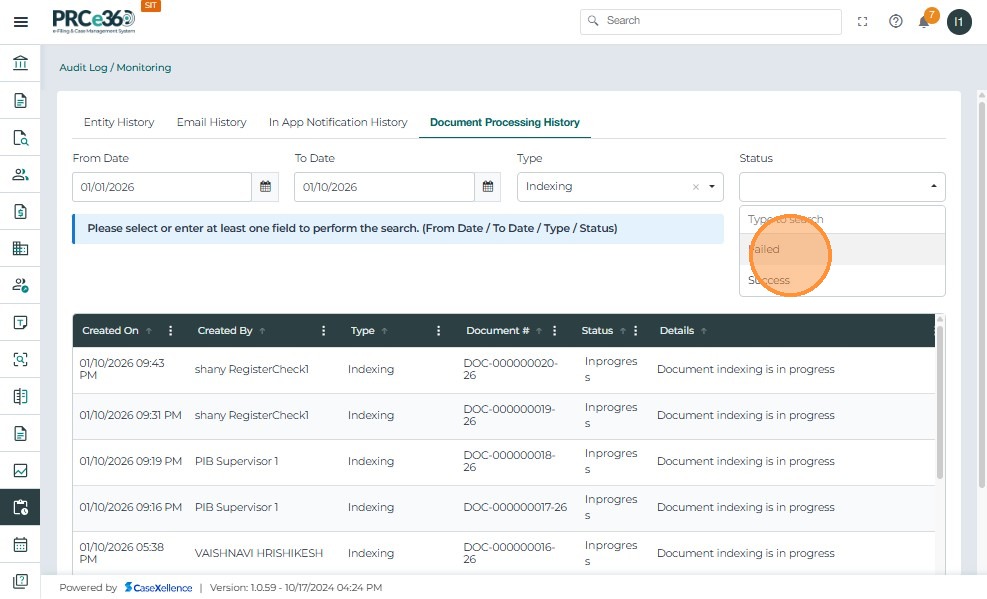 - Click the Document Processing History tab to view the processing status of system-handled documents.