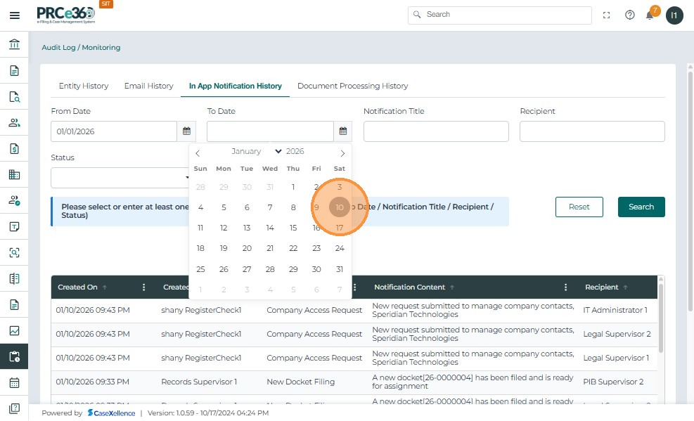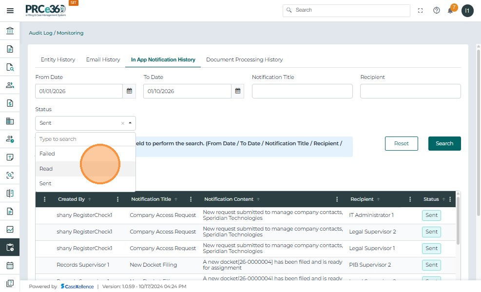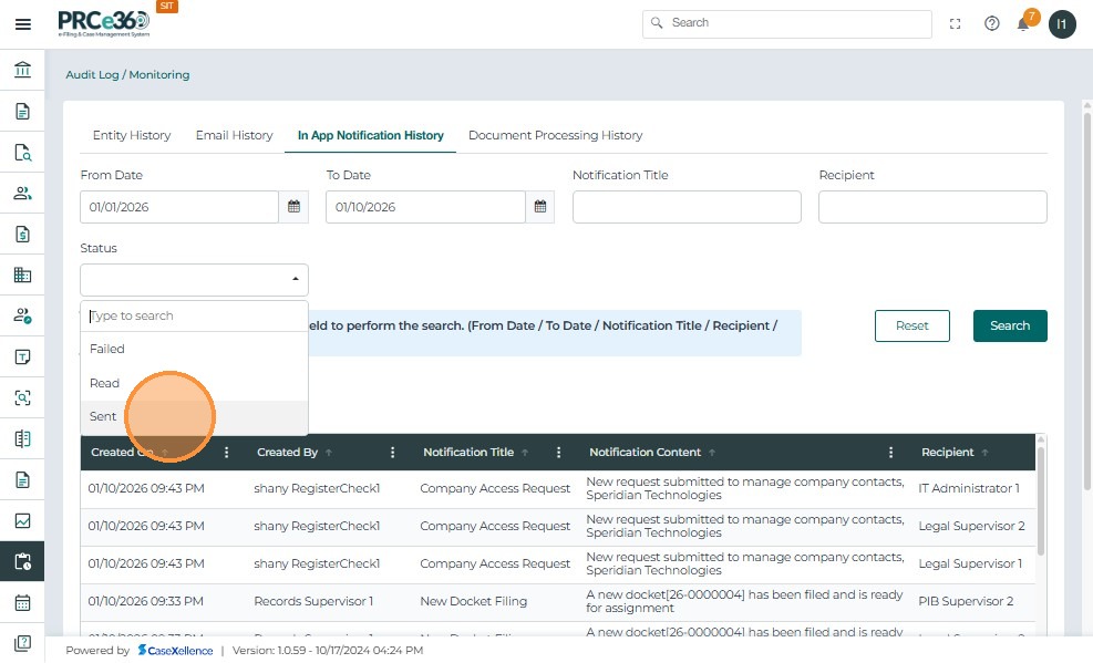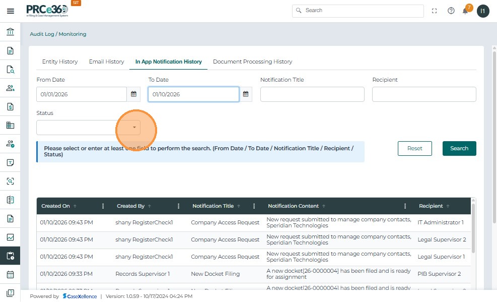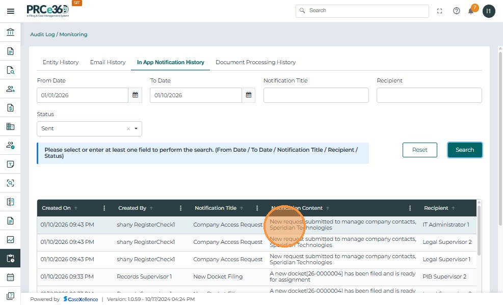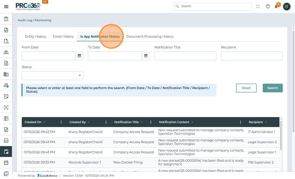 - In-App Notification History: Shows all system-generated in-app notifications. Users can filter by date, notification title, recipient, or status and review the notification content and recipients.