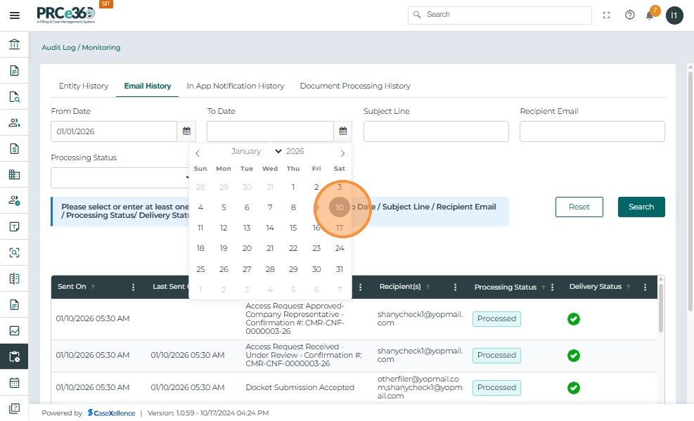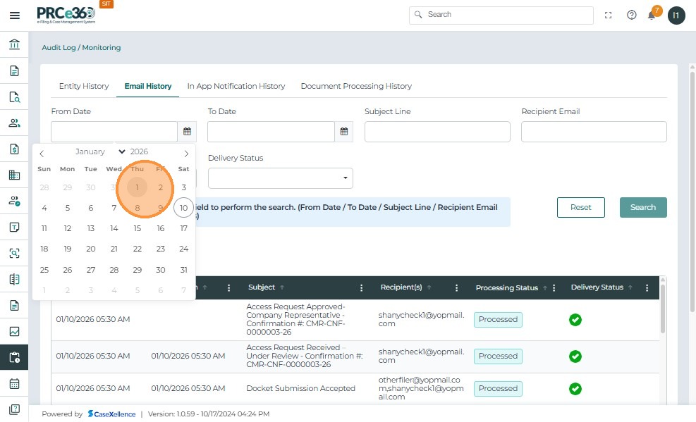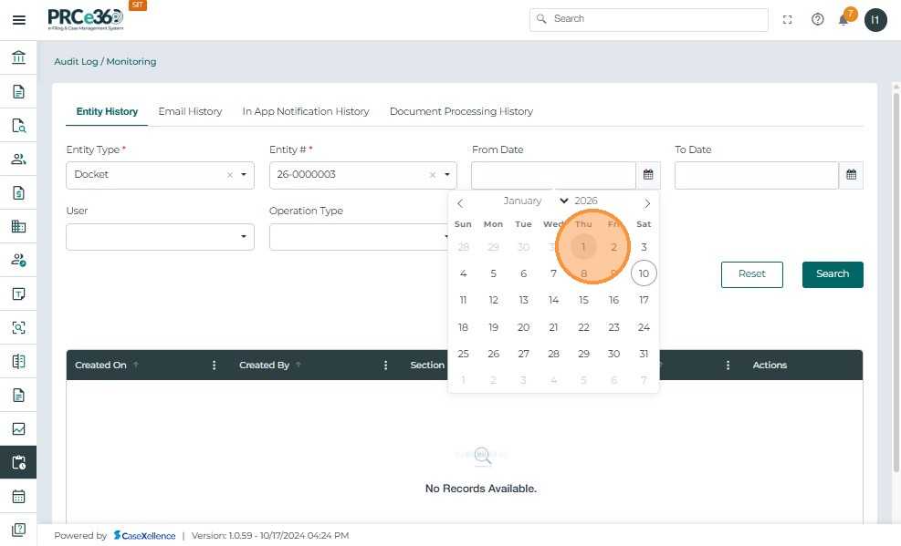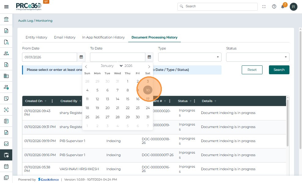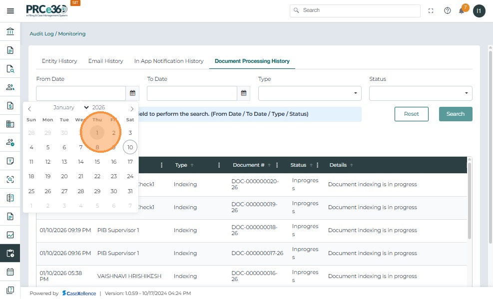 - Click the From Date calendar icon and select the start date to filter document processing records.